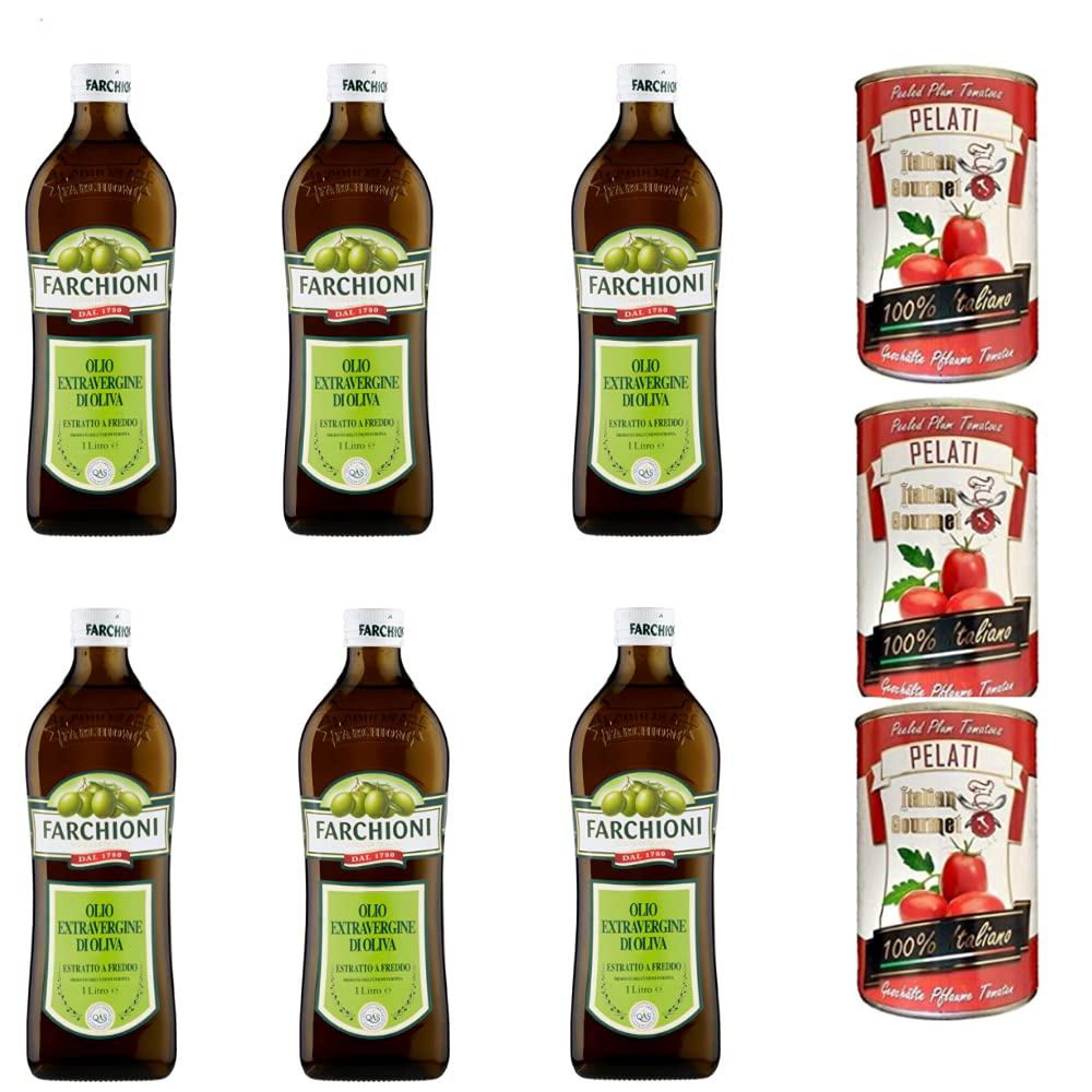 6x Farchioni Classico extra inheemse olijfolie 1000 ml olio vergine oliva 1 l Italiaanse gourmet 100 Italiaanse geschilde tomatenblikjes 3x 400 g