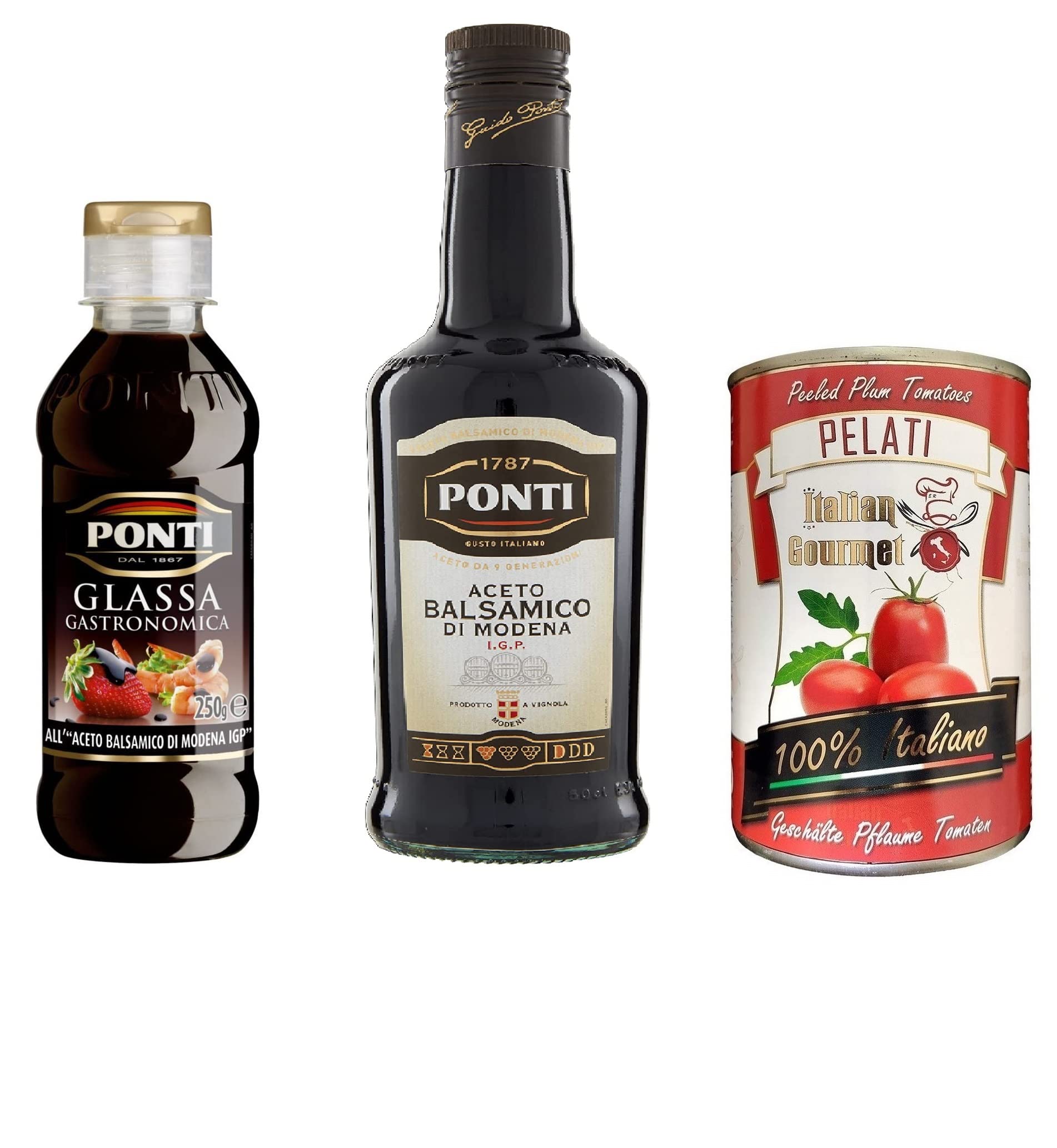 Ponti Aceto Balsamico di Modena g.A. 1 x 500 ml crème aceto Balsamico di Modena x 200 ml 1 x Italiaanse Gourmet 100 Italiaanse geschilde tomatenblikjes 400 g