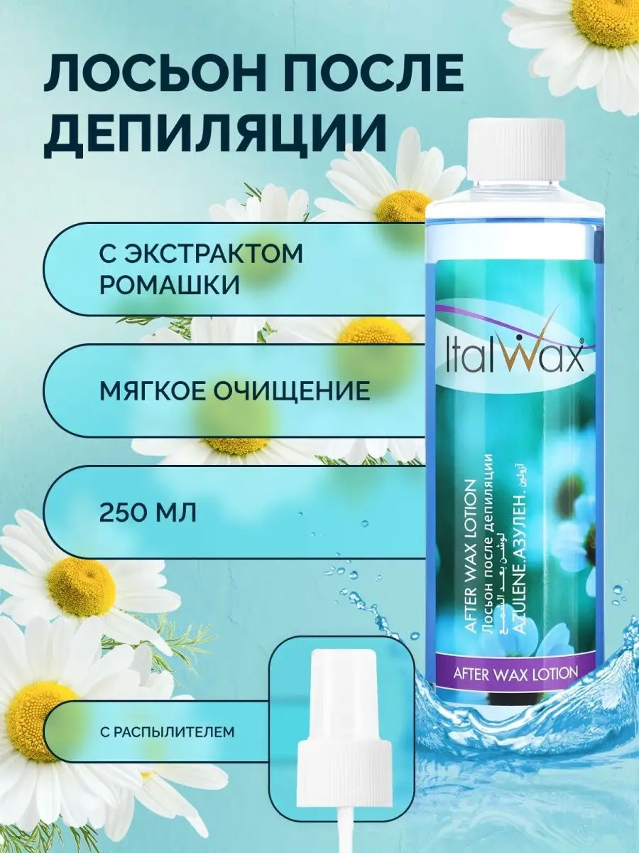 Косметический лосьон после депиляции помогает сохранить красоту и здоровье кожи на завершающем этапе процедуры удаления волос. Лосьоны After Wax Lotion с распылителем для удаления остатков воска после процедуры обеспечивают эффективный уход за телом и комфортны в использовании. Очищающий лосьон подходит как для женщин, так и для мужчин. Спрей хорошо впитывается, быстро высыхает и не оставляет на коже ощущения липкости. Увлажняющий лосьон для тела оказывает профессиональный уход, сохраняя гладкость и шелковистость кожи на долгое время. Гипоаллергенная косметика безопасна в использовании и не вызывает раздражения, поэтому подходит для всех типов кожи, в том числе для проблемной и чувствительной. Средство рекомендовано использовать для ног и для рук. Лосьон после восковой депиляции "Азулен" - легкий и маслянистый. Снимает раздражение, успокаивает и смягчает кожу, не оставляя никакой жирности. Моментально впитывается! Профессиональные товары для депиляции от Italwax (Италвакс) подходят для салона красоты и домашнего использования. Нажмите на логотип продавца KRASOTKAPRO и подберите качественную уходовую косметику, гарантирующую отличный результат.