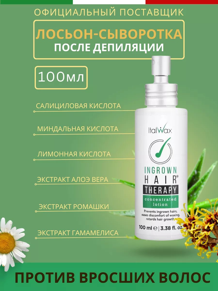 Лосьон-сыворотка против вросших волос ItalWax. Лосьон создан специально для предотвращения врастания волос после депиляции на больших поверхностях(руки, ноги), а также для лечения последствий вросших волос.Активные компоненты сыворотки: салициловая кислота;миндальная кислота; лимонная кислота; экстракт алоэ вера; экстракт ромашки; экстракт гамамелиса. Жидкий концентрированный лосьон быстро впитывается и активно размягчает верхний слой кожи. Лосьон-сыворотка оказывает активное смягчающее, противовоспалительное и заживляющее действие. Данный лосьон значительно уменьшает покраснение и отек. Для профилактики рекомендуется применять 1-2 раза в сутки на протяжении 7-10 дней после процедуры депиляции. При лечение уже вросших волос применяется по необходимости несколько раз в день.
