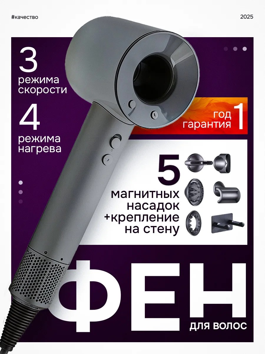 Мощный и стильный фен для волос 5в1 с пятью магнитными насадками — идеальное решение для укладки, и создания объема. Этот профессиональный стайлер обеспечивает безопасную сушку и гладкость волос благодаря инновационной технологии ионизации воздушного потока. Уникальная функция снятия статического электричества устраняет пушистость волос, сохраняя естественную влагу в структуре прядей.