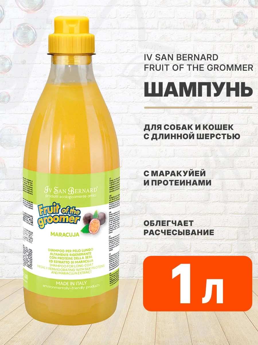 IV SAN BERNARD FRUIT OF THE GROOMER MARACUJA SHAMPOO шампунь Маракуйя с протеинами для длинношерстных собак и кошек. Шампунь с маракуйей и протеинами Iv San Bernard FRUIT OF THE GROOMER MARACUJA SHAMPOO для длинношерстных собак и кошек. Ароматическая линейка SPA-средств FRUIT OF THE GROOMER («Фрукты от грумера») - это нежнейшая и благоухающая фруктовыми оттенками линия специально для того, чтобы Ваш питомец почувствовал себя красивым и любимым!Шампунь с маракуйей и протеинами FRUIT OF THE GROOMER разработан специально для длинношерстных собак и кошек.Нежный, витаминизированный шампунь, подходящий для частого мытья, делает шерсть гладкой, блестящей и шелковистой, облегчает расчесывание, обладает оживляющим эффектом.Шампунь разработан для частого применения.Способ применения: