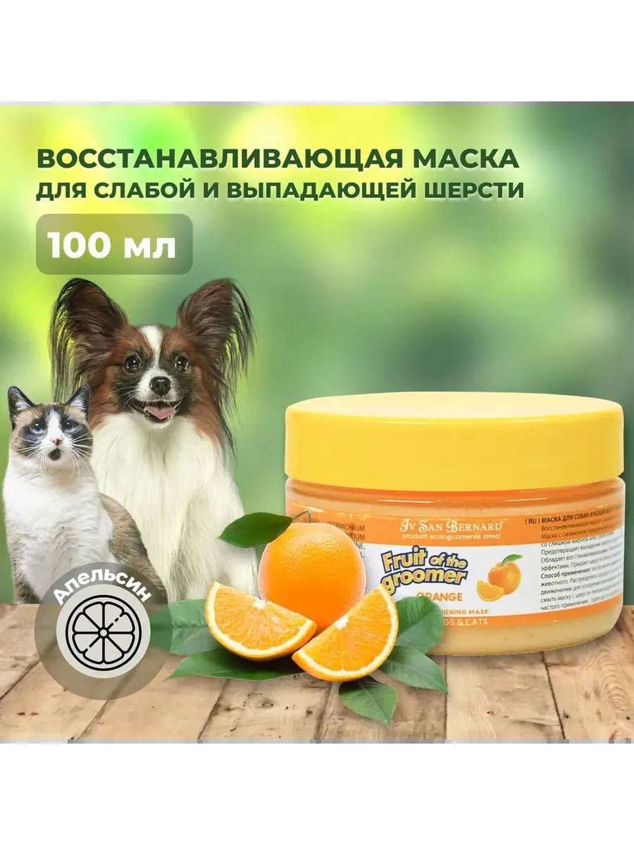 Восстагавливающая маска Iv San Bernard Fruit of the Groomer Orange для слабой выпадающей шерсти Маска разработана для слишком жирной или сухой кожи и выпадающей шерсти. Предотвращает выпадение шерсти и заметно её останавливает. Борется с последствиями стресса, обладает восстанавливающим, питательным, увлажняющим и тонизирующим эффектами. Придает блеск и шелковистость шерсти, оставляет комфортные ощущения после применения. Способ применения: на чистую вымытую влажную шерсть нанести массирующими движениями, оставить на 5-10 мин., смыть водой, высушить шерсть. Разработано для профессионального применения. Средство прошло микробиологическое тестирование. Не глотать, хранить в местах, недоступных детям.