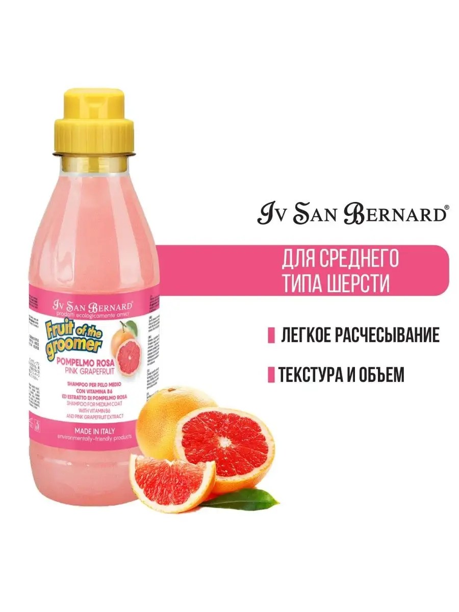 Шампунь Iv San Bernard Fruit of the Groomer Pink Grapefruit для шерсти средней длины с витаминами. Шампунь разработан для частого применения. Обладает очищающим и тонизирующим эффектами. Оставляет шерсть блестящей и ухоженной. Полезные свойства растительных компонентов цитрусовых смешаны с защитным и укрепляющим действием витаминов. Природный дезодорирующий аромат розового грейпфрута создает приятное настроение. Способ применения: нанести достаточное количество шампуня на хорошо смоченную шерсть массирующими движениями. Оставить на 3 мин., смыть водой. При необходимости повторить. Для удобства применения можно разбавить шампунь водой 1:3. Для наилучшего эффекта после шампуня используйте маску - восстановитель "Розовый грейпфрут с витаминами".