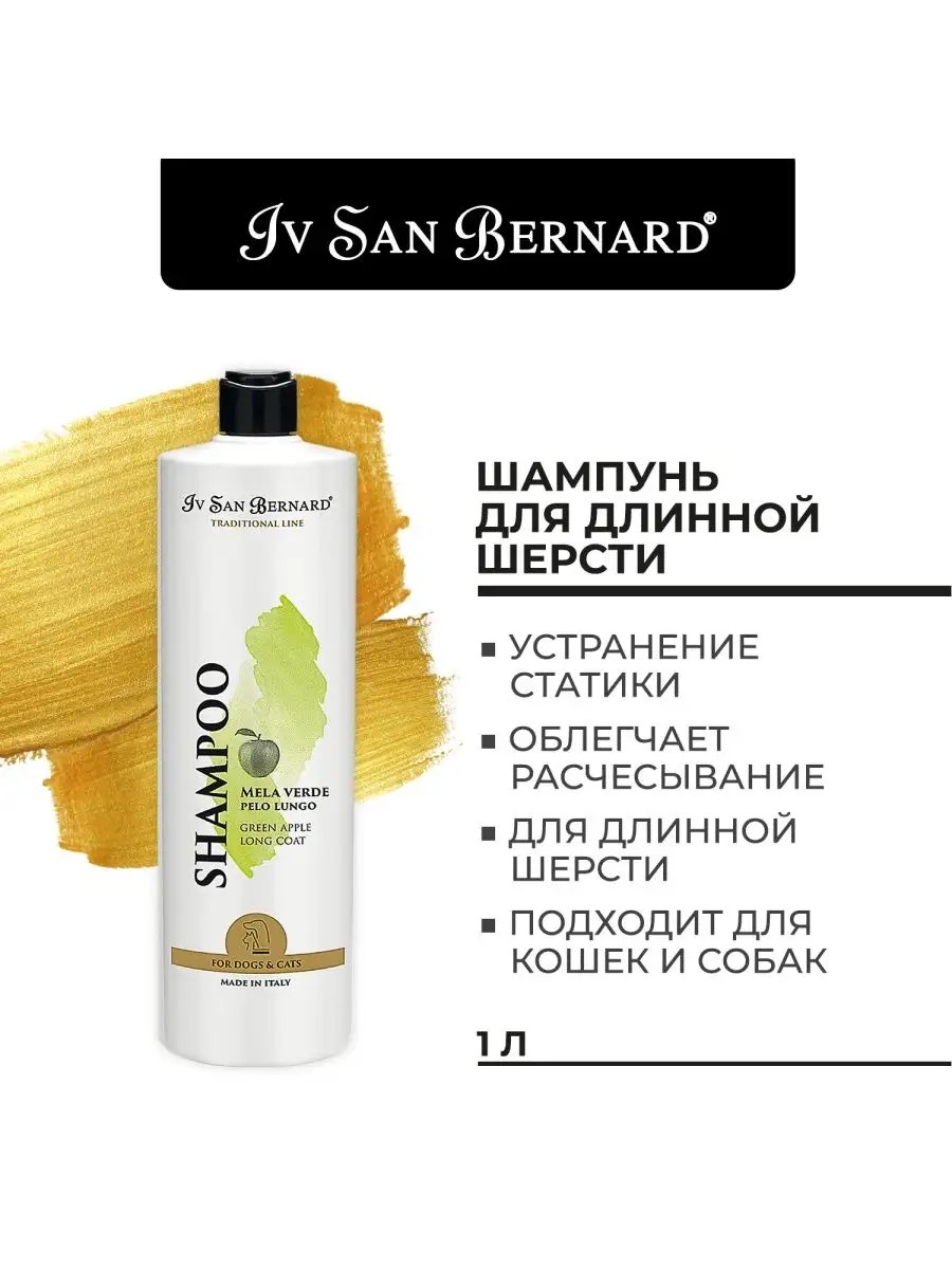 Iv San Bernard Traditional Line Green Apple Shampoo for Long Hair. This green apple-scented shampoo is for long-haired dogs and cats. It moisturizes and restores the coat, softening and adding shine. It facilitates combing and helps remove tangles without irritating the animal's skin. Directions: Dilute 1 part shampoo with 3 parts water. Apply the shampoo to pre-wetted coat. Rub in gently for several minutes. Rinse thoroughly with warm water. For best results, follow with Yves San Bernard Green Apple Conditioner.