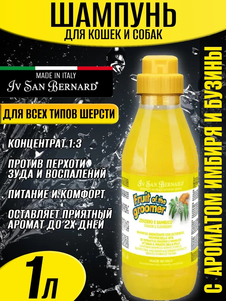 Iv San Bernard Fruit of the Groomer Ginger&Elderbery – это не просто уход за шерстью, этот шампунь для кошек и для собак объемом 1000 мл (1 л) обеспечивает антибактериальное действие и уменьшает испытывающий кожный зуд. Его специальные косметические, лечебные компоненты делают шерсть наполненной, выглядящей пушистой, блестящей и шелковистой.