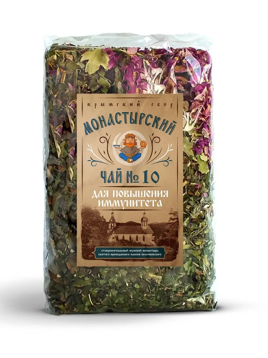 Крымский сбор №10 входит эхинацея, плоды шиповника и боярышника, роза, чабрец, иссоп и другие травы, необходимые для повышения иммунитета. Эхинацея широко используется как иммуностимулятор, повышающий в крови количество веществ, усиливающих активность фагоцитов клеток, поглощающих всё, что вредно для организма бактерии, инородные частицы, умирающие клетки. Фиточай Монастырский №10 является профилактическим средством при авитаминозе, нехватке микроэлементов, оказывает омолаживающее действие на организм, укрепляет иммунитет. Способ применения: 1 столовая ложка на стакан кипятка. настоять 15-20 минут и пить как чай. Мёд или сахар добавлять по вкусу.Противопоказания: аллергия на один из компонентов.Не является лекарственным средством.