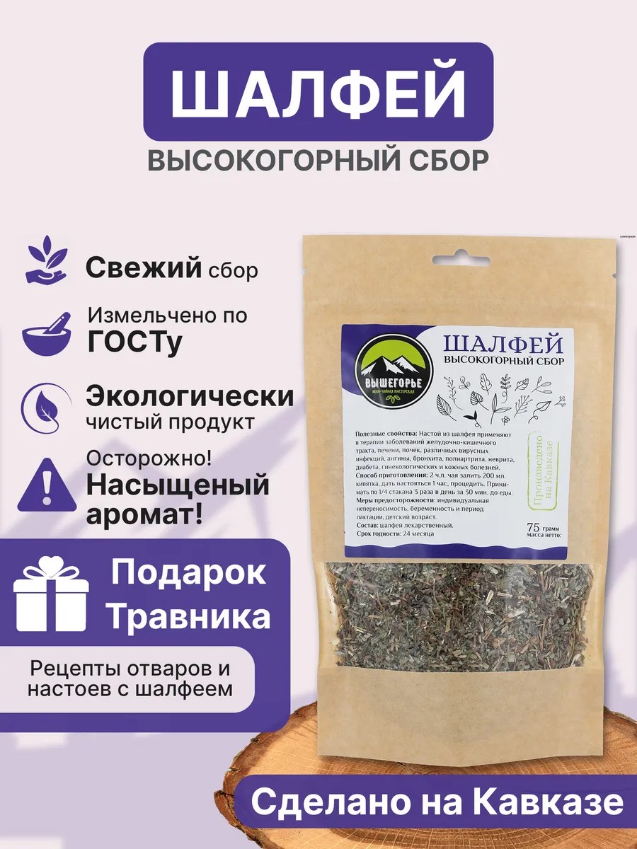 Мы гарантируем высокое качество нашей продукции. Наша шалфей трава собирается в высокогорье Кавказа, где она растёт в экологически чистых условиях, на плодородной вулканической почве. Шалфей проходит измельчение по стандартам Фармакопеи, что обеспечивает однородность массы, точности дозирования при приготовлении отваров и настоев, способствует максимальному извлечению полезных веществ при заваривании.