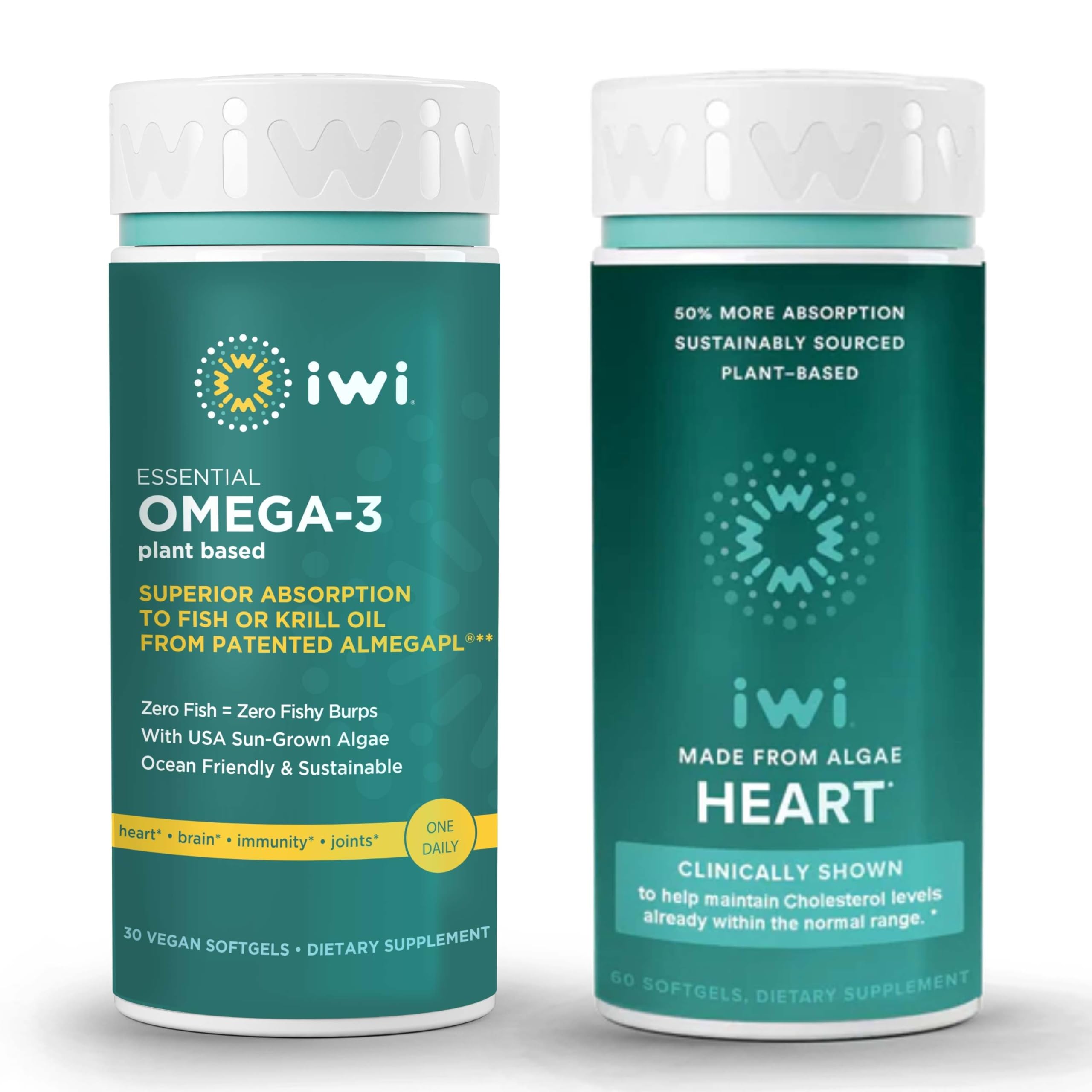 Sustainably Sourced: AlmegaPL algae extract is grown and harvested on iwi life farms in the USA on non-arable land requiring zero fresh water. Superior Absorption: Our triple-patented form of algal omega-3 is clinically verified to have superior bioavailability . Supports Heart Health: Our Heart Omega-3 blend provides ultra-concentrated EPA from sustainably grown algae clinically shown to support cardiovascular health . Give Your Body A Daily Dose of True DHA EPA: Our Omega-3 Essential provides DHA and EPA from sustainably grown algae for muscle, heart, and mood support . More Algae-Based Nutrition: Our Omega-3 Essential and Heart Bundle includes 1 bottle of Omega-3 Essential and 1 bottle of Heart Omega-3, 30 servings each. iwi life products are designed to be stacked. Meet your health goals faster by layering the nutrition in iwi life's focused formulas.