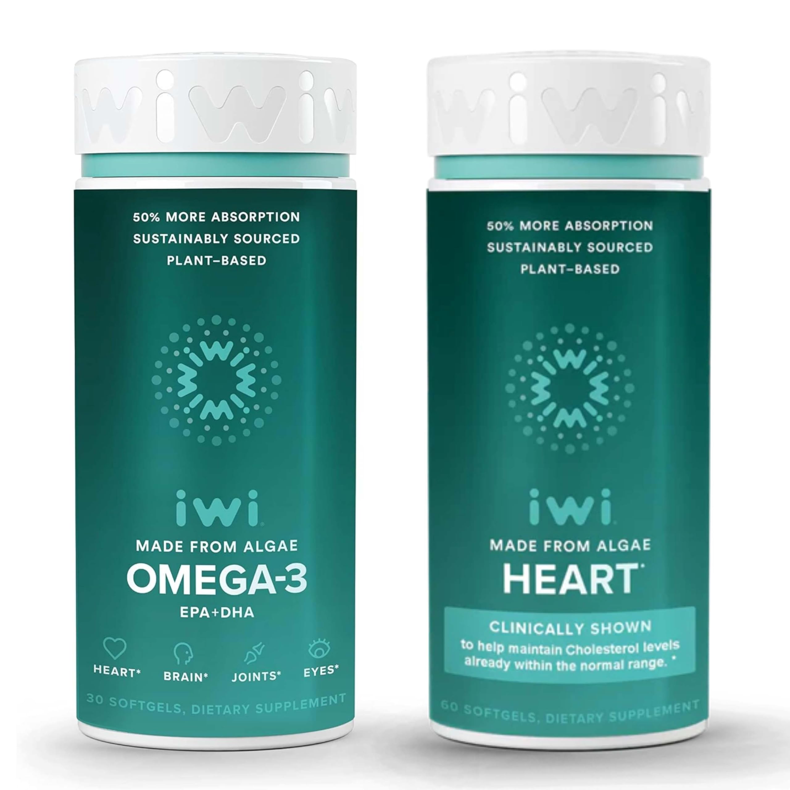 Iwi Omega-3 & Heart Omega-3 Bundle 30 Servings Vegan Plant-Based Algae Omega 3 Krill & Fish Oil Alternative No Fishy Aftertaste