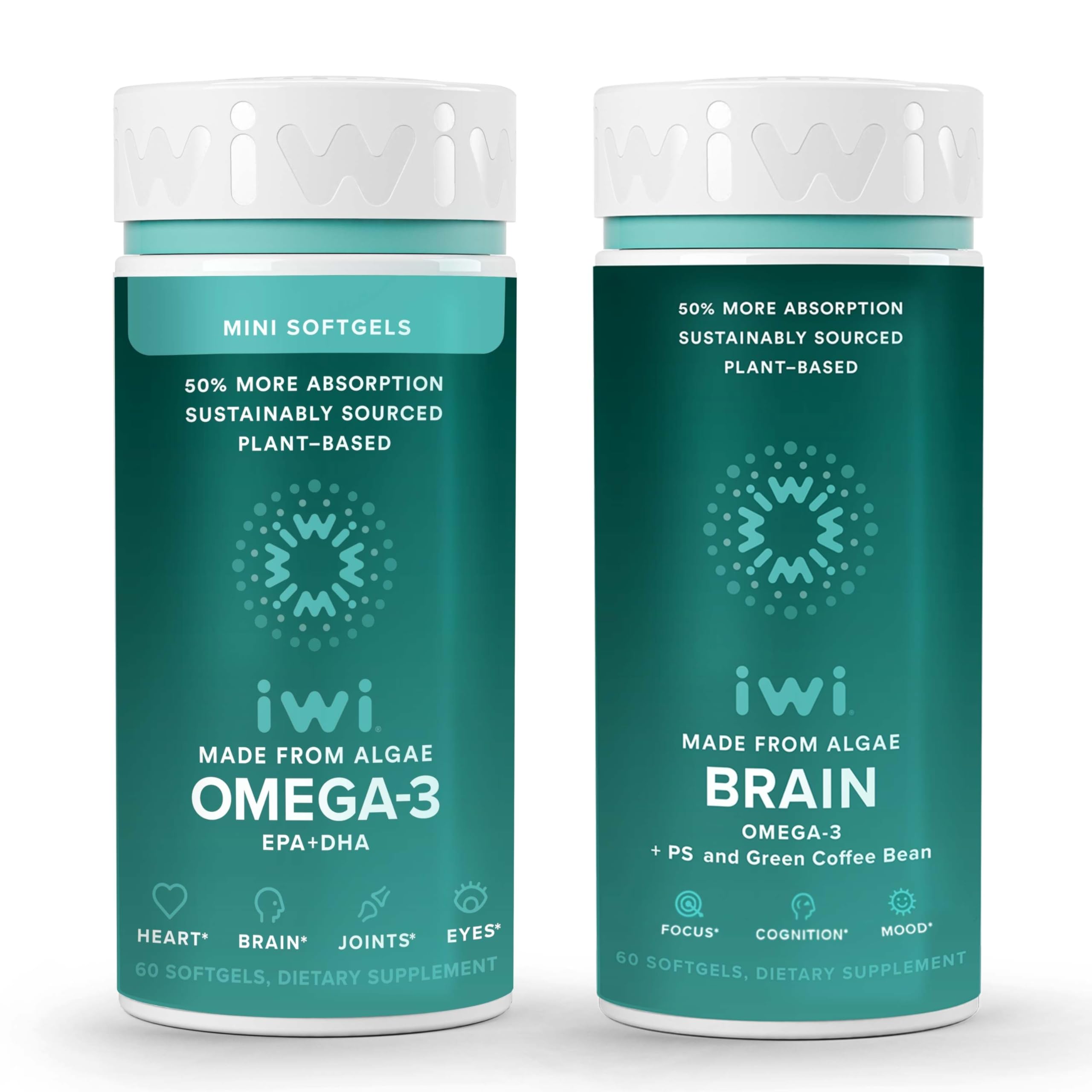 Sustainably Sourced: AlmegaPL algae extract is grown and harvested on iwi life farms in the USA on non-arable land requiring zero fresh water. Superior Absorption: Our triple-patented form of algal omega-3 is clinically verified to have superior bioavailability . Mental Focus: Our Brain Omega-3 blend provides a high concentration of EPA and DHA from sustainably grown algae along with clinically studied nootropic nutrients to promote mental focus . Nourish Your Heart, Brain and Body: Our Omega-3 provides a high concentration of EPA and DHA from sustainably grown algae for whole-body support . More Algae-Based Nutrition: Our Omega-3 Minis and Brain Bundle includes 1 bottle of Omega-3 Minis and 1 bottle of Brain Omega-3, 30 servings each. iwi life products are designed to be stacked. Meet your health goals faster by layering the nutrition in iwi life's focused formulas.
