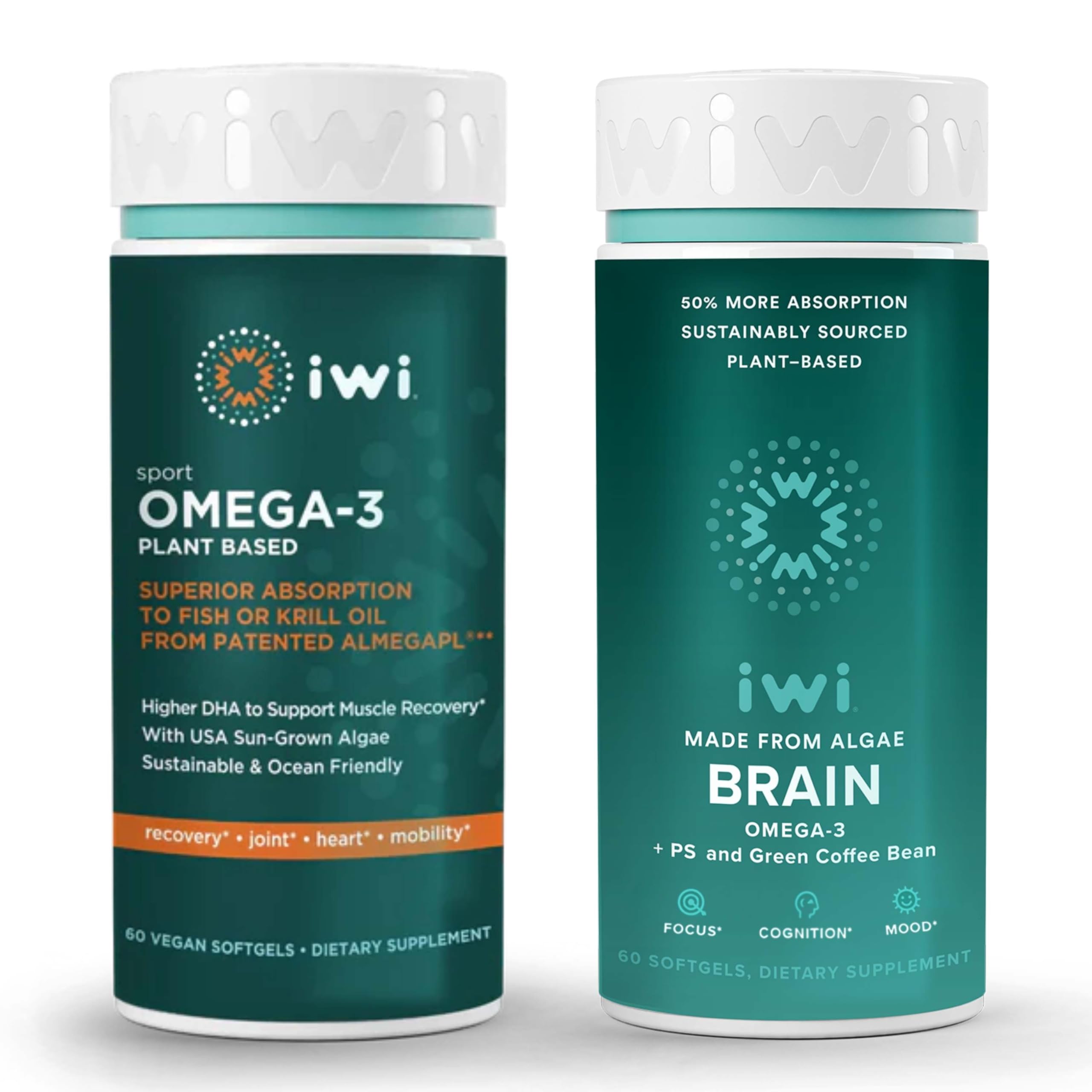 Sustainably Sourced: AlmegaPL algae extract is grown and harvested on iwi life farms in the USA on non-arable land requiring zero fresh water. Superior Absorption: Our triple-patented form of algal omega-3 is clinically verified to have superior bioavailability . Mental Focus: Our Brain Omega-3 blend provides a high concentration of EPA and DHA from sustainably grown algae along with clinically studied nootropic nutrients to promote mental focus . Fuel Your Workout: Our Omega-3 Sport provides a high concentration of DHA from sustainably grown algae to support musculoskeletal health and emotional well-being . More Algae-Based Nutrition: Our Omega-3 Sport and Brain Bundle includes 1 bottle of Omega-3 Sport and 1 bottle of Brain Omega-3, 30 servings each. iwi life products are designed to be stacked. Meet your health goals faster by layering the nutrition in iwi life's focused formulas.