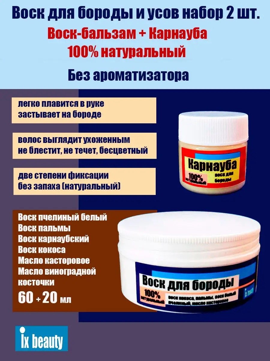 Воски твердые для ухода за бородой, усами, бровями, набор из двух штук. На основе 100% натуральных восков и масел - воск пчелиный белый, воск пальмы, воск кокоса, воск карнаубский, масло касторовое, масло виноградной косточки. Без ароматизаторов, имеет натуральный легкий запах воска. Натуральные воски - это не лак для волос, они не превращаются в клей и не держат волосы прочно в заданной форме. Их состав подобран так, что в банке они в твердом виде, на ладони плавятся , а на бороде снова застывают. Волос выглядит более толстым, насыщенной окраски и здорового блеска за счет заполнения пор восками. Воск остается мягким и вытирается руками, смывается теплой водой, но это не масло, т е он не блестит маслом, не стекает и не пачкает. Это уходовый вариант, воск не впитывается в кожу, для питания лучше применять жидкое масло. Порядок применения натуральных восков для бороды есть на ютубе. Твердость в банке такая, что можно отковыривать обратной стороной ногтя или использовать подходящую пластинку из дерева или пластика. Использовать за раз очень небольшое количество, не доводя до блеска масляного волос.Воск для бороды 60 мл - это среднее между воском и бальзамом, фиксация легкая, уходовая для всей бороды , на ладони плавится легко, равномерно распределяется по волосам.Воск Карнауба 20 мл - на основе карнаубского воска, самого твердого из природных восков, но в определенном составе, иначе его невозможно было бы расплавить на ладони. Фиксация более сильная и может застывать более толстым слоем. Применять на отдельных участках , где это необходимо.Для курильщиков рекомендуем обратить внимание на воск, ароматизированный кумарином, который используется для ароматизации трубочного табака. Его присутствие маскирует и облагородит остаточные запахи табака на волосах.