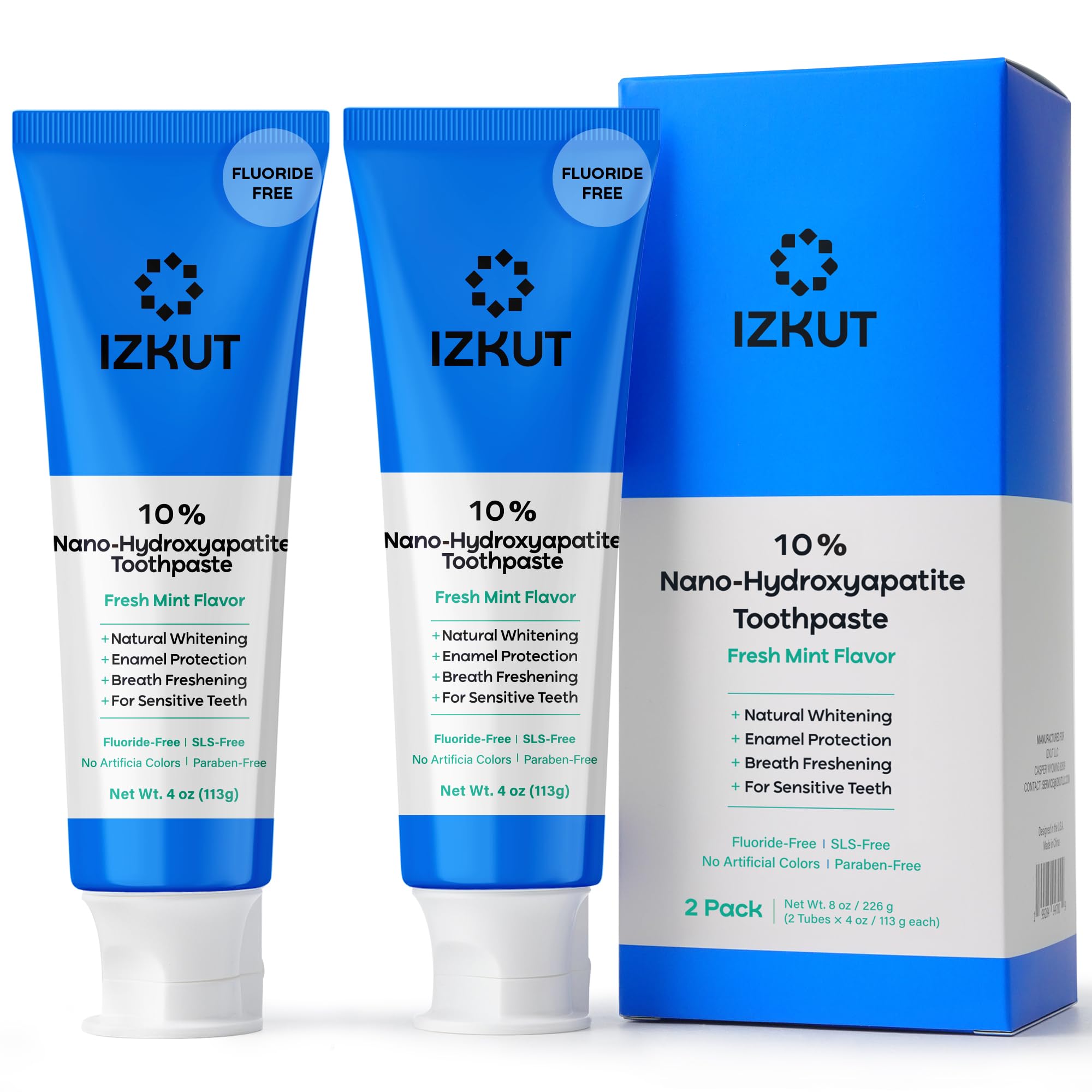 IZKUT 10% Nano Hydroxyapatite Toothpaste: Fluoride Free Natural Whitening Toothpaste for Sensitive Teeth, Enamel Support, Plaque Remover, SLS Free, Fresh Mint Flavor, Adults & Kids, 4 oz (Pack of 2)