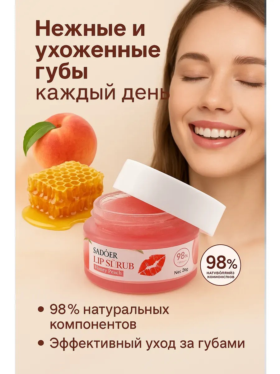 Sadoer Honey Peach Lip Scrub is designed for gentle and caring care of delicate skin. Containing 98% natural ingredients, it effectively removes dead skin cells, restoring smoothness and natural softness to lips. This honey-peach scrub deeply moisturizes, nourishes, and prevents dryness, leaving lips looking well-groomed and attractive. With regular use, it helps reduce fine lines and cracks, improves lip color, and prepares lips for lipstick or gloss. Its light texture and pleasant peach aroma make this treatment a pleasure. This scrub is suitable for daily use and for all skin types. It's ideal for any time of year, especially during the colder months, when lips require extra nourishment and protection. The 20g jar is convenient to take with you, ensuring your lips always remain soft and smooth.