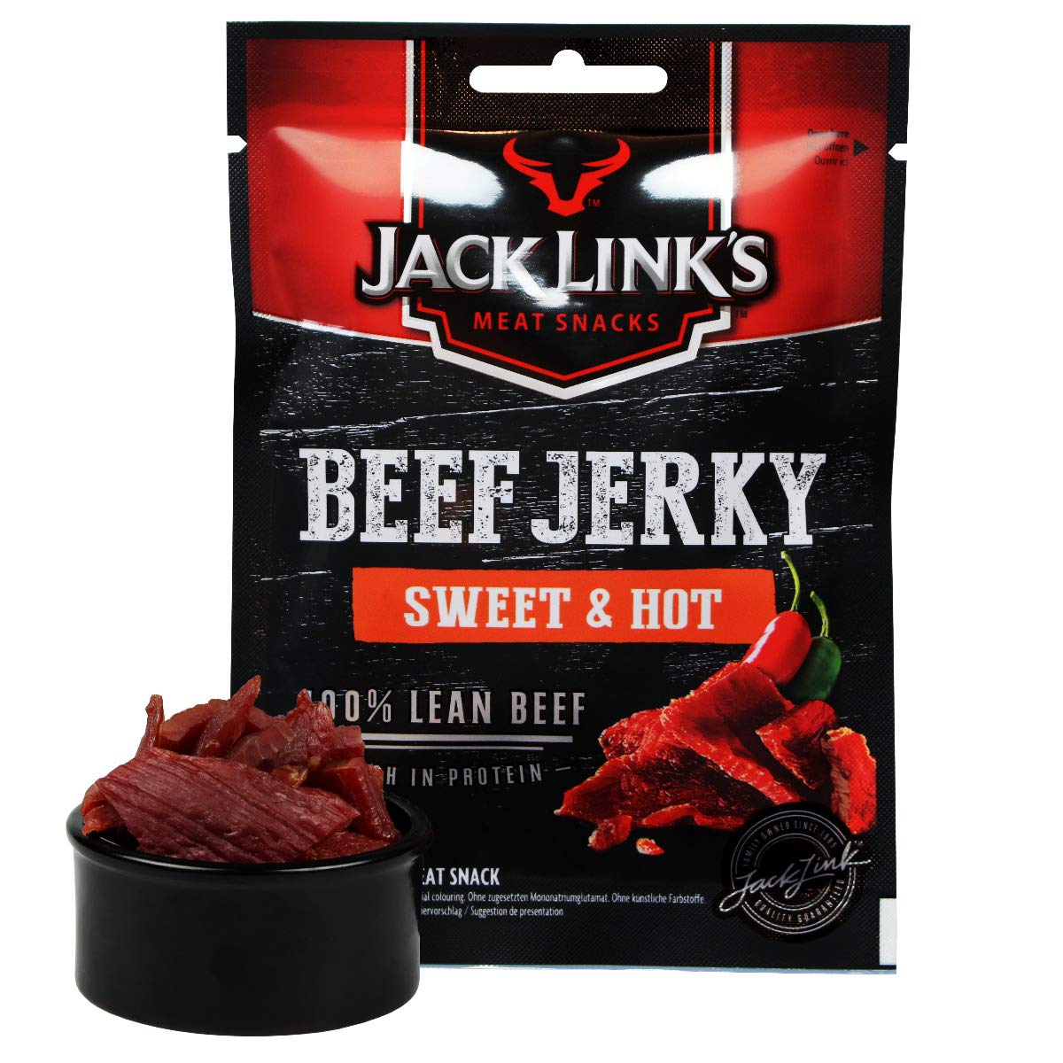 The product contains CELERY! Ingredients: beef, sugar, sea salt, yeast extract, garlic powder, spices (contains CELERY), nitrite curing salt (salt, preservative: sodium nitrite), flavoring, onion powder, antioxidant: rosemary extract, acidity regulator: citric acid, pineapple powder, nutritional value 1196 KJ: calorific value per 100 grams 2282 kcal 39g protein Carbohydrates 24g of which sugar 24g 3.4g fat of which saturated 1.3g Salt 2.9g It's Brazilian Beef INGREDIENTS Ingredients: Beef, Sugar, Sea Salt, Yeast Extract, Garlic Powder, Spices (Contains CELERY), Nitrite Curing Salt (Salt, Preservative: Sodium Nitrite), Flavoring, Onion Powder, Antioxidant: Rosemary Extract, Acidity Regulator: Citric Acid, Pineapple Powder Nutritional Values per 100 grams: Calorific Value 1196 KJ 2282 kcal 39g Protein Carbohydrates 24g of which sugars 24g 3.4g Fat of which saturated 1.3g Salt 2.9gLow in fat. Less than 65 kcal bag. Traditional Beef Jerky Recipe. Le produit contient du CÉLERI ! Ingrédients : bœuf, sucre, sel marin, extrait de levure, ail en poudre, épices (contient du CÉLERI), sel de salaison nitrite (sel, conservateur : nitrite de sodium), arôme, poudre d'oignon, antioxydant : extrait de romarin, correcteur d'acidité : acide citrique, poudre d'ananas, valeur nutritionnelle 1196 KJ : valeur calorifique pour 100 grammes 2282 kcal 39g de protéines Glucides 24g dont sucre 24 g 3,4 g de matières grasses dont saturé 1,3g Sel 2.9g C'est du boeuf brésilien INGRÉDIENTS Ingrédients : bœuf, sucre, sel marin, extrait de levure, ail en poudre, épices (contient du CÉLERI), sel de salaison nitrite (sel, conservateur : nitrite de sodium), arôme, poudre d'oignon, antioxydant : extrait de romarin, correcteur d'acidité : acide citrique, poudre d'ananas Valeurs nutritionnelles pour 100 grammes : valeur calorifique 1196 KJ 2282 kcal 39g de protéines Glucides 24g dont sucre 24 g 3, 4 g de matières grasses dont saturé 1,3g Sel 2.9gPauvre en graisse. Moins de 65 kcal sachet. Recettes tradition de Boeuf Séché.