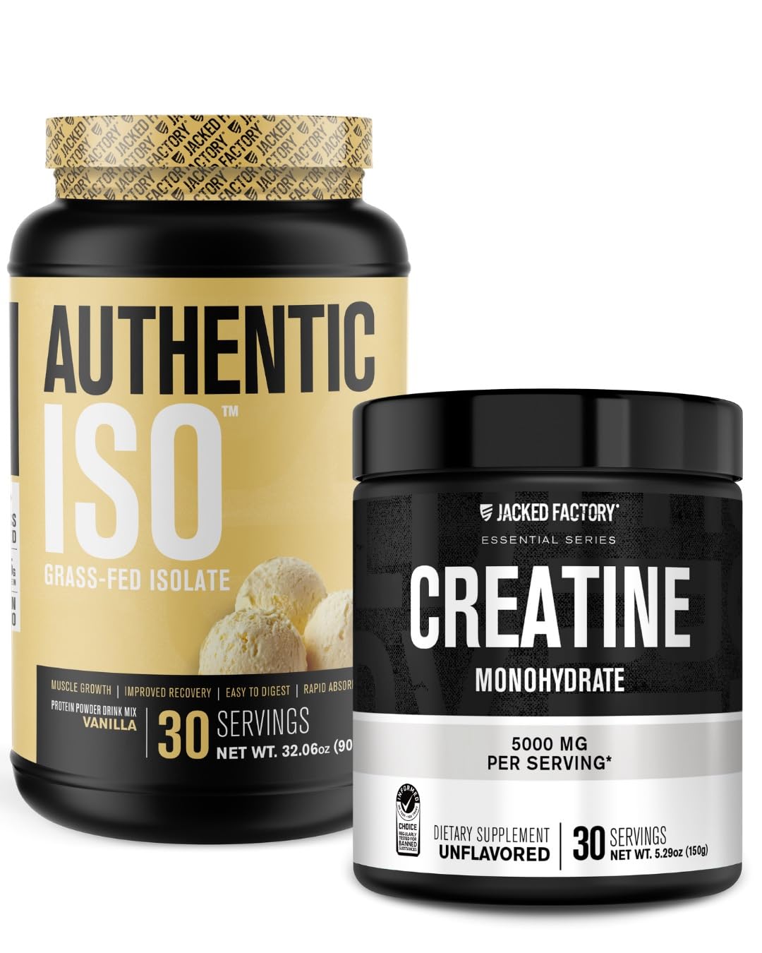Jacked Factory Authentic ISO Grass Fed Whey Protein Isolate Powder - Low Carb Non-GMO Muscle Building Protein (30 Servings Vanilla) Creatine Monohydrate Powder (30 Servings Unflavored)