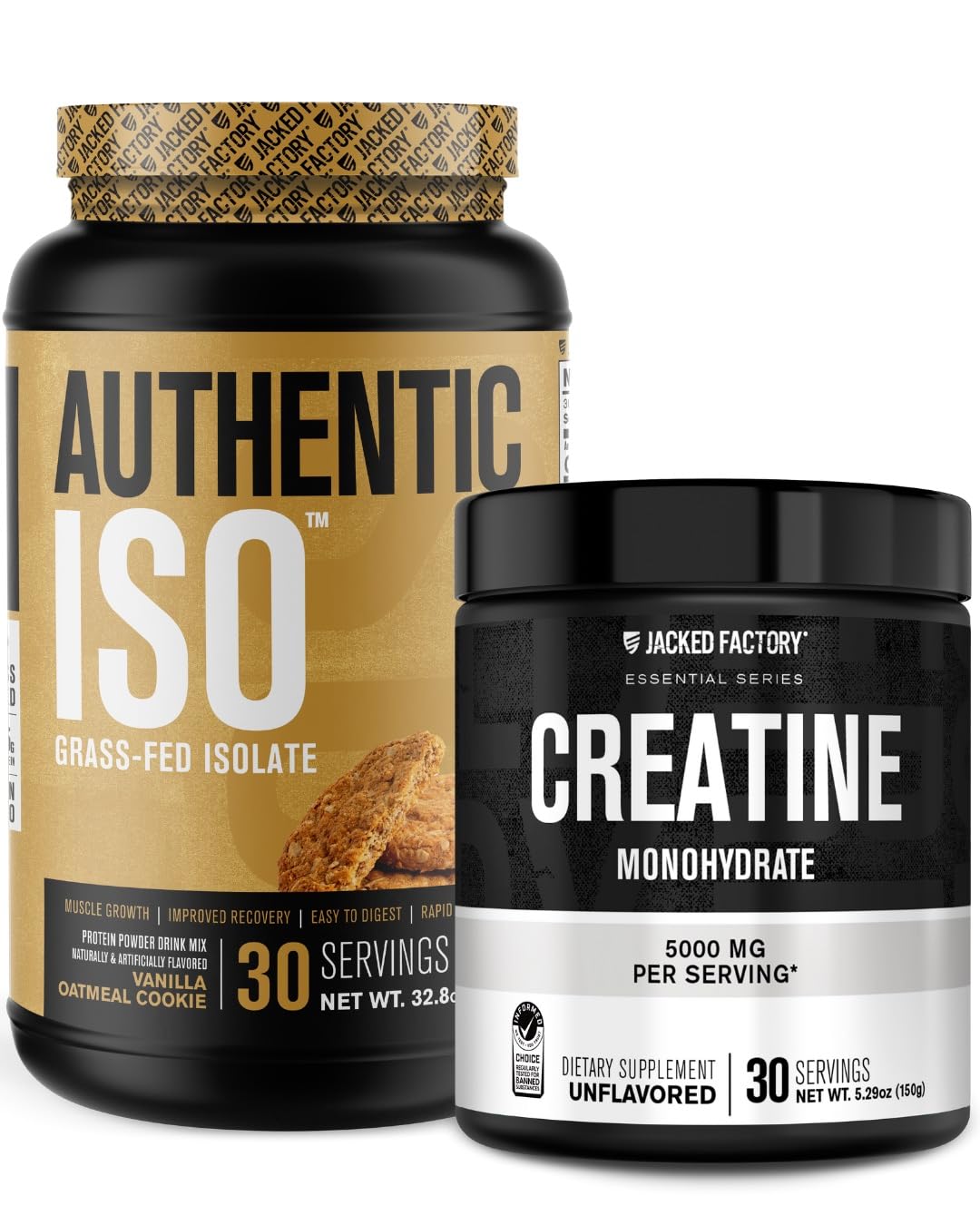 Jacked Factory Authentic ISO Grass Fed Whey Protein Isolate Powder - Low Carb Non-GMO Muscle Building Protein (30 Servings Vanilla Oatmeal Cookie) Creatine Monohydrate Powder (30 Servings)
