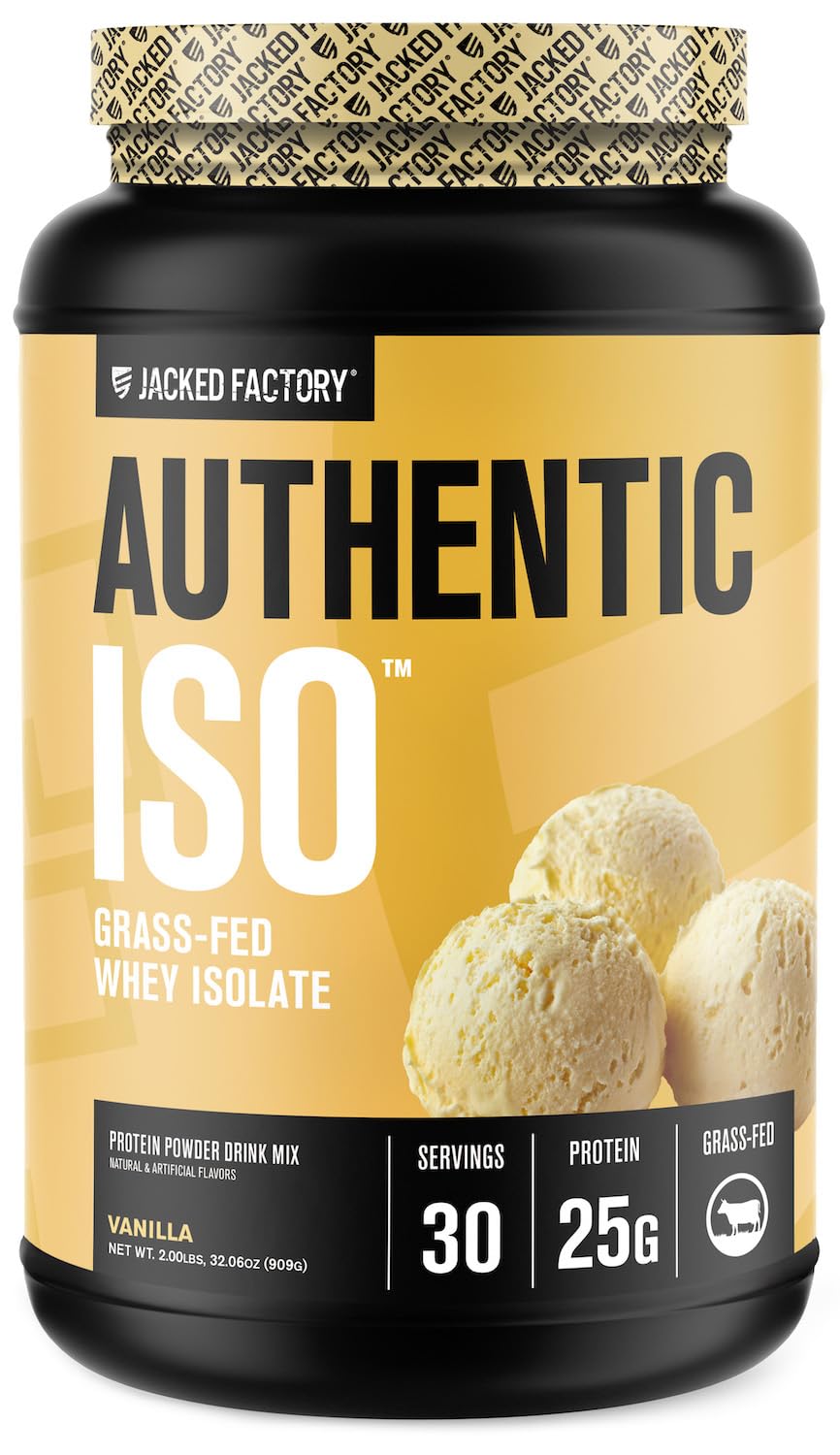 Manufactured in a cGMP-Certified Facility: Unlike many dietary supplements, all Jacked Factory products are manufactured under stringent quality control standards to ensure proper purity and potency. This formula is completely free of harsh chemicals, fillers, and artificial food dyes. Rapid Absorption & Easy to Digest: A clean, delicious, rapidly absorbed, and easy-to-digest protein powder made with ultra-pure grass-fed whey protein isolate - nature's ideal source of essential amino acids that ignite muscle protein synthesis. Enhance Recovery, Increase Strength, and Perform Your Best: Authentic ISO protein powder gives you a highly bioavailable protein that is light on the stomach and goes down easily. No bloating, gas, or stomach cramps like you might experience from low-quality whey protein powders that are loaded with fillers and added sugars. Our grass-fed whey protein isolate goes to work rapidly so you can recover quicker, increase strength, and perform your best in the trenches and on the playing field!. 25g of Protein per Serving: Authentic ISO is not your typical cheap-grade whey protein powder. Our ultrapure whey protein isolate comes exclusively from grass-fed cattle that are never treated with synthetic chemicals or hormones to ensure a healthier and cleaner profile of nutrients. Each serving of Authentic ISO packs more than 25 g of delicious muscle-building protein with virtually no sugar or fat. Ultrapure Grass-Fed Whey Protein Isolate Powder: Authentic ISO is a clean, delicious, fast-acting, and easily digestible whey protein powder made with ultrapure grass-fed whey protein isolate - Mother Nature’s ideal source of essential amino acids that drive lean muscle growth. Authentic ISO works quickly to replenish and repair lean muscle tissue, making it ideal for kickstarting the recovery process after a workout or any time you want a healthy protein source.
