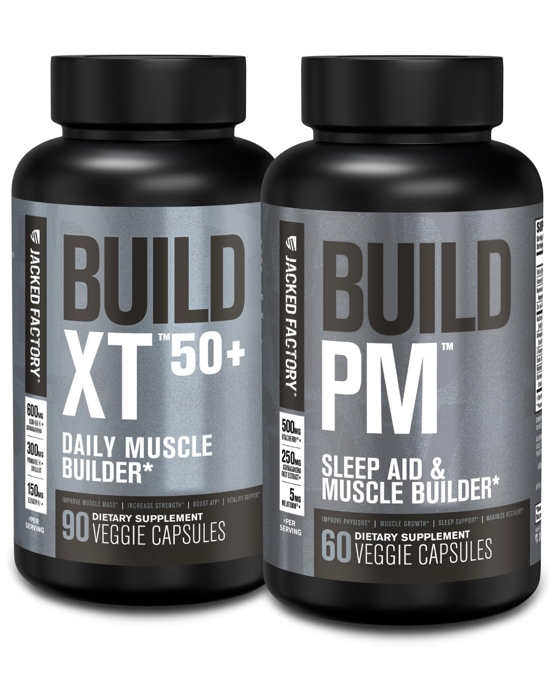 Jacked Factory Build-XT 50+ Daily Muscle Builder (90 Capsules) & Build PM Night Time Muscle Builder & Sleep Aid (60 Capsules) for Muscle Growth Vitality & Recovery