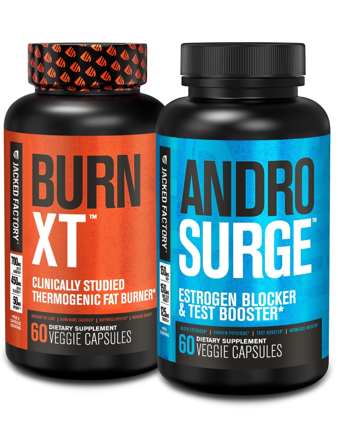 Your Weight-Loss Journey is the Destination. Losing weight and getting lean takes dedication and commitment. Our mission is to make the journey a little easier with innovative, fully transparent formulas and science-backed educational resources you can count on. cGMP USA Manufacturing: All Jacked Factory supplements are manufactured in a state-of-the-art cGMP facility using premium raw materials that are tested for purity, potency, and authenticity. Be confident that each bottle of our product contains precisely what’s on the label and nothing more. Build Muscle & Increase Muscle Definition: Optimize your natural potential for maximum muscle building. Androsurge works as a muscle builder by promoting muscle fullness during your training and reducing muscle catabolism. While Burn-XT helps with fat loss to increase muscle definition. Elite Estrogen Blocker for Men: Androsurge is the first scientifically-dosed, non-proprietary blend, all-natural estrogen reducing supplement for men. Featuring research-supported ingredients such as grape seed extract and diindolylmethane (DIM). Not a Miracle Fat Burner: Let’s be honest: no fat loss supplements will magically get rid of belly fat overnight. But with the right diet and training plan in place, a properly formulated body composition stack can help you burn fat and lose weight in stubborn areas while maintaining hard-earned muscle tissue. Containing ingredients like caffeine and green tea extract, this stack can help support your fitness goals.
