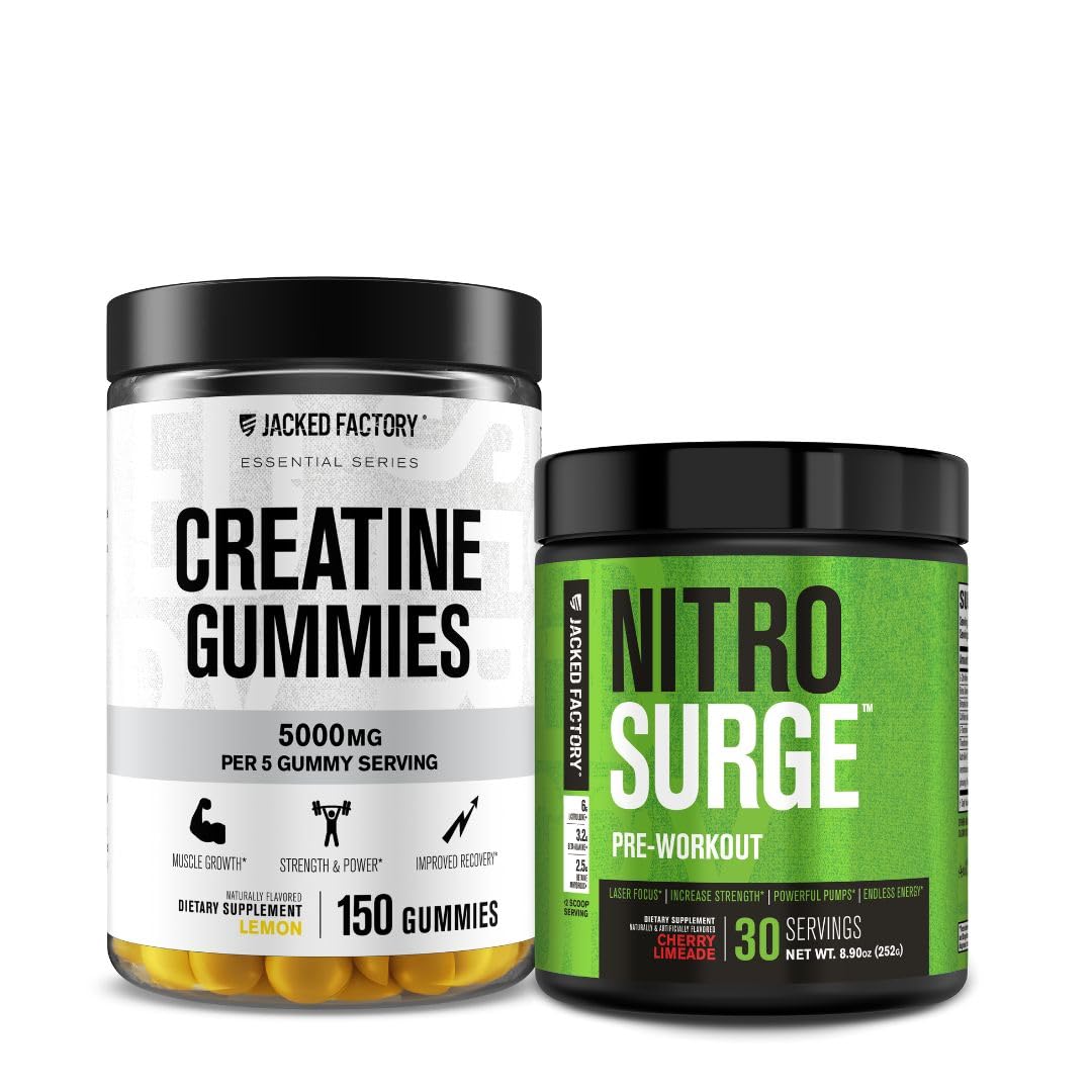 Best Pre-Workout Supplement for Athletes Gym-Goers: We went the extra mile to create a science-backed, pre workout powder that helps improve body composition and athletic performance without the side effects of harsh stimulants and banned ingredients. Nitrosurge contains clean, effective, and pure ingredients that athletes and gym-goers can count on, including L-Citrulline, Betaine Anhydrous, Beta-Alanine, Caffeine, L-Theanine, and more. Pre Workout Powder for Energy, Strength, Vascularity: Nitrosurge is a creatine-free pre-workout for men and women, formulated with evidence-based ingredients that boost nitric oxide (NO), energy, and strength for hours on end. As a best rated pre workout supplement , Nitrosurge delivers peak performance, laser focus, and intense pumps every single training session. Naturally Increase Muscle Growth: Creatine supplementation increases strength, power, endurance, and muscle hypertrophy in athletes and those who engage in demanding training. Creatine monohydrate can be used for daily muscle-building support and is a must-have supplement for anyone serious about building muscle, increg power, and improving overall athletic performance. Backed by Science: Creatine monohydrate remains the gold standard of creatine supplements, with hundreds of research studies proving its effectiveness in athletes, bodybuilders, and gym-goers alike. It's the most thoroughly studied form of creatine, proven to enhance athletic performance, muscle building, and recovery by acting directly on muscle cells to boost phosphocreatine levels. Creatine gummies provide the same benefits and bioavailability as powdered creatine in a more convenient form. Creatine Gummies for Active Men and Women: Designed for athletes, bodybuilders, fitness enthusiasts, and anyone looking to improve performance in the gym or on the field, Jacked Factory Creatine Monohydrate Gummies deliver 5,000 mg of pure creatine monohydrate in just 5 tasty, easy-to-chew gummies. Perfect for busy lifestyles, these convenient gummies can be used as a daily muscle-building supplement, making it easy to take your creatine anytime, anywhere - no shaker bottle required.