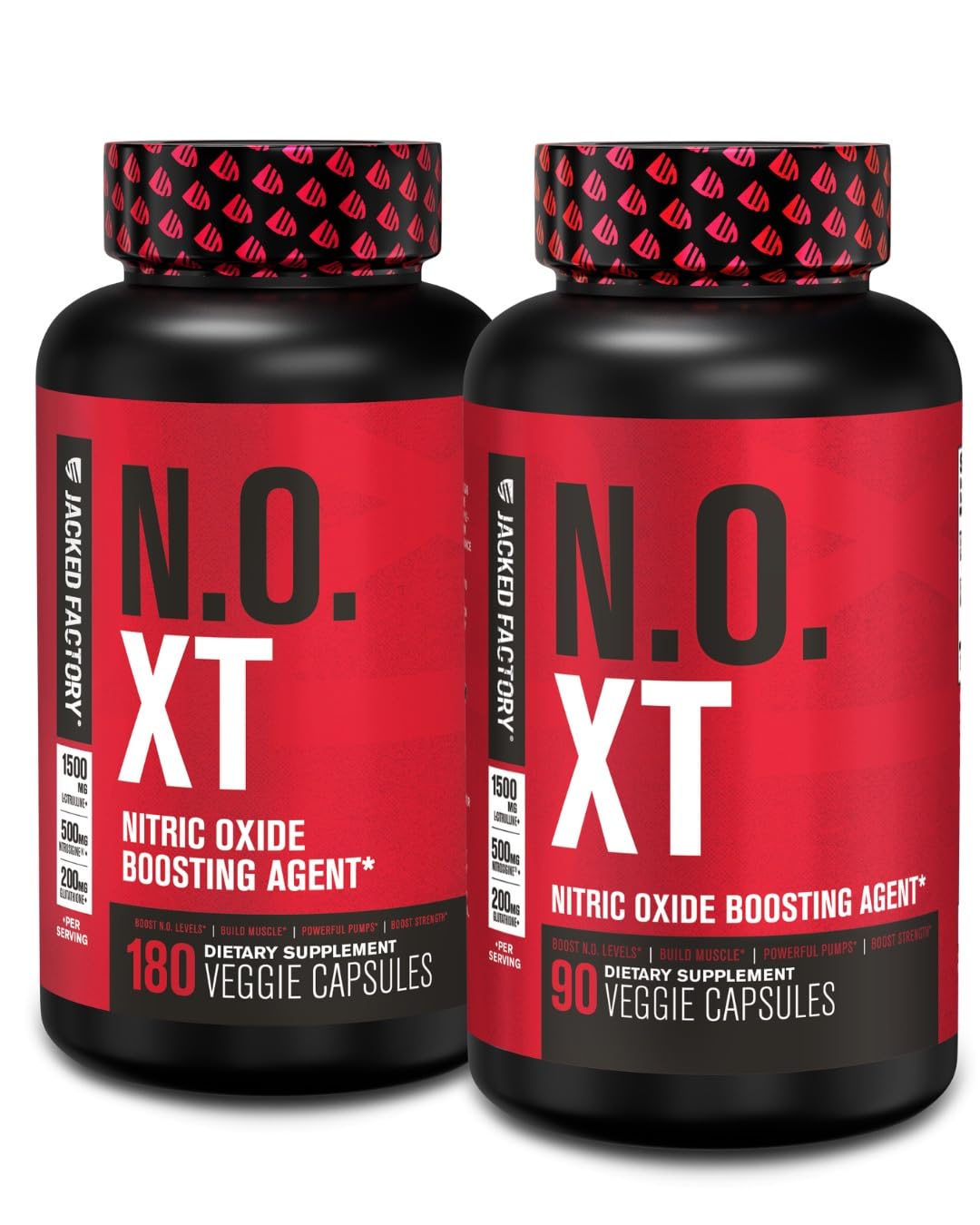 Manufactured in a cGMP-Certified Facility: All Jacked Factory products are manufactured under stringent quality control standards to ensure proper purity and potency. This formula is completely free of harsh chemicals, fillers, and artificial food dyes. Cutting-Edge Formula: N.O. XT uses only premium N.O boosting ingredients, including the most potent form of L-Arginine on the market—Nitrosigine Inositol-Stabilized Arginine Silicate. Stacked with L Citrulline, L Glutathione, and Bioperine, N.O XT is a hard-hitting nitric oxide supplement for both men and women. Increases Pre Workout Efficiency: Jacked Factory's nitric oxide booster push your exercise to a new level. The strong combination of the L-Arginine, L Citrulline and Nitrosigine work synergistically to increase nitric oxide production, bring you strong muscular pumps and endurance, and delay fatigue in the gym. Boosts Energy, Muscle Growth and Recovery: Boosting nitric oxide helps fuel nutrient delivery to working muscle tissue, creating an optimal anabolic environment for muscle building. The increased blood flow will enhance your pumps, strength, and endurance in the gym. Elite Nitric Oxide Booster: Power through your workouts with skin-tearing pumps, endless endurance, and increased strength. N.O. XT is scientifically formulated using cutting-edge ingredients that help boost nitric oxide and enhance vascularity.