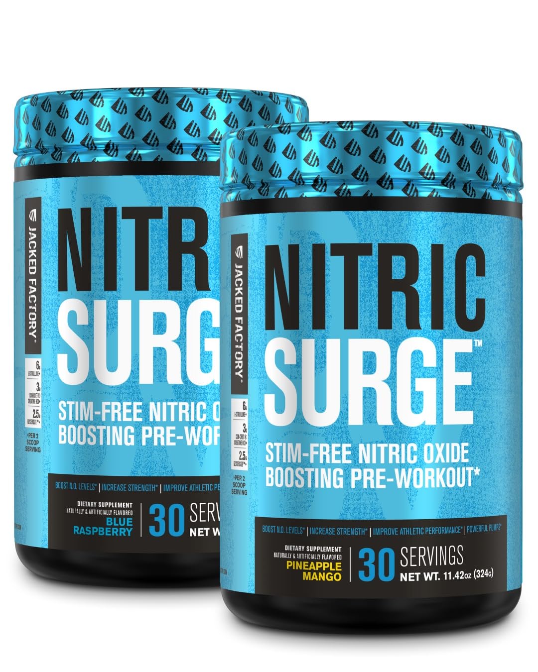Jacked Factory Nitric Surge Stim Free Pre Workout Powder - Caffeine Free (Blue Raspberry 30 Servings) & (Pineapple Mango 30 Servings)