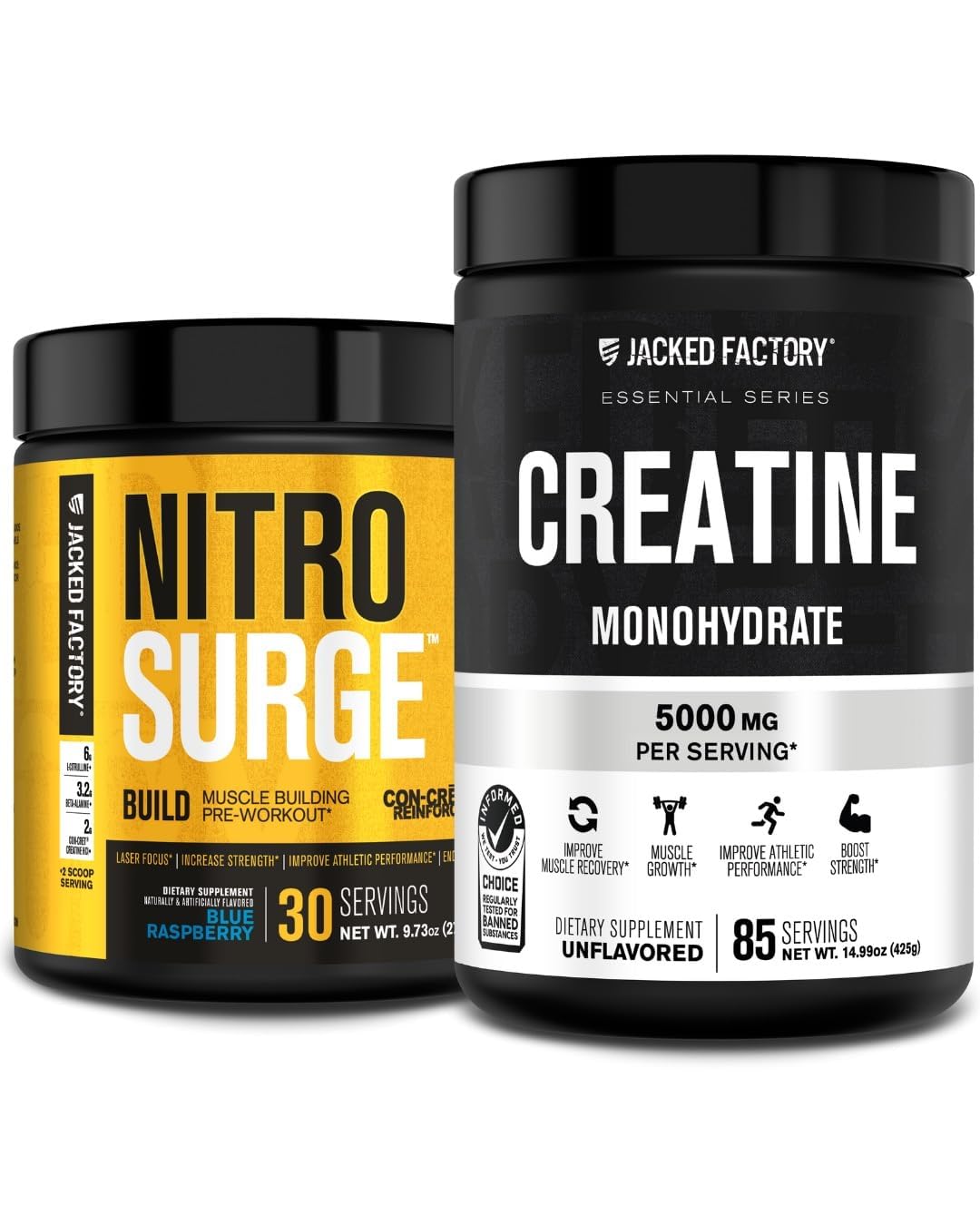 Jacked Factory Nitrosurge Build Pre Workout with Creatine for Muscle Building (30 Servings Blue Raspberry) & Creatine Monohydrate Powder for Muscle Growth,Increased Strength (85 Servings Unflavored)