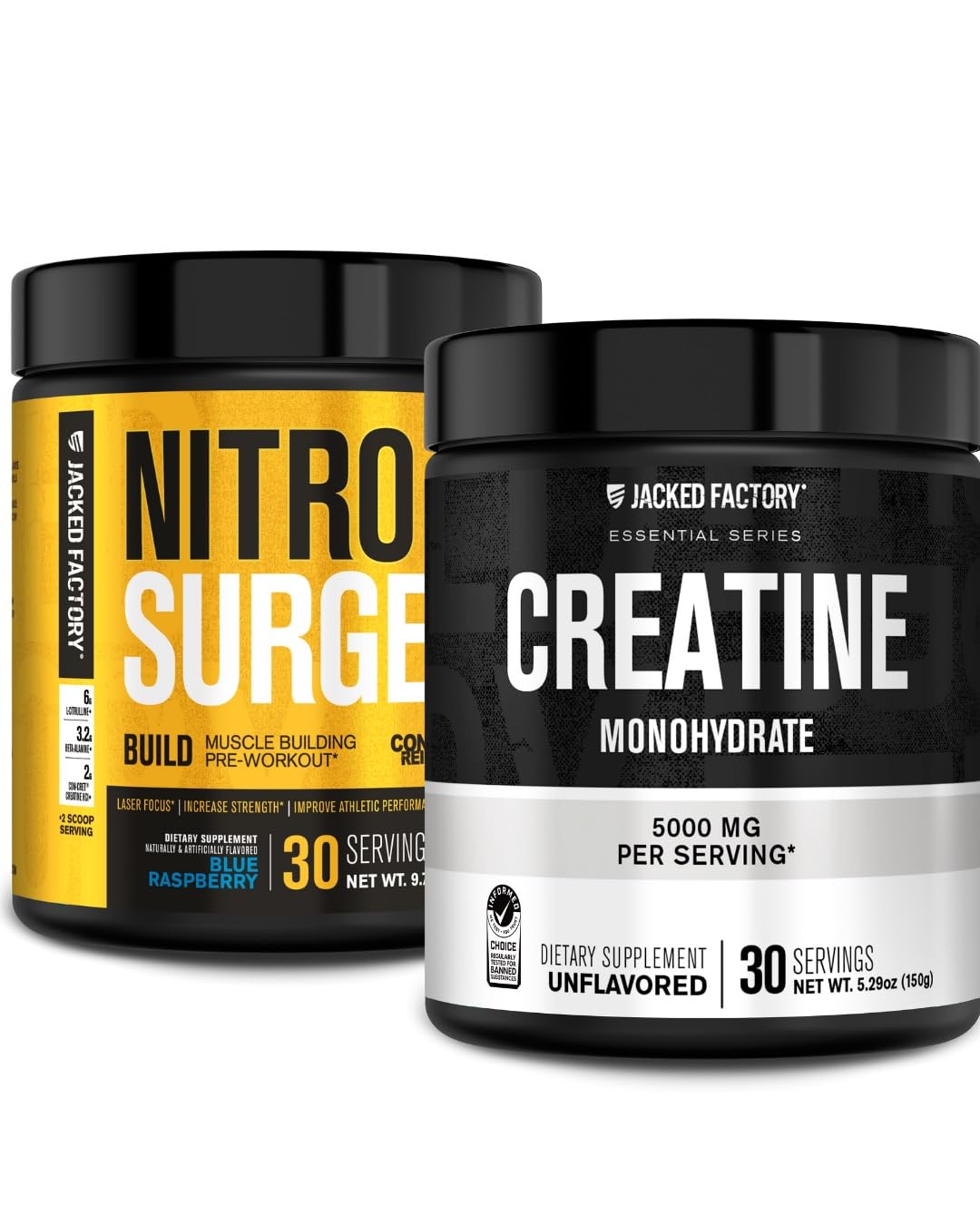 Jacked Factory Nitrosurge Build Pre Workout with Creatine for Muscle Building (30 Servings Blue Raspberry) & Creatine Monohydrate Powder for Muscle Growth & Recovery (30 Servings Unflavored)