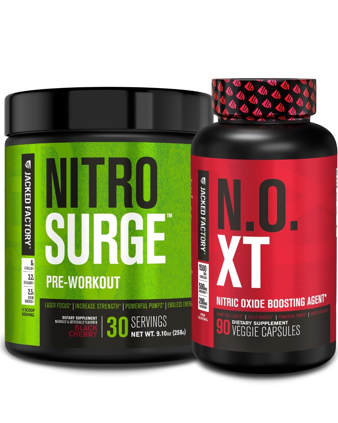 Jacked Factory Nitrosurge Pre-Workout in Black Cherry & N.O. XT Nitric Oxide Booster for Men & Women