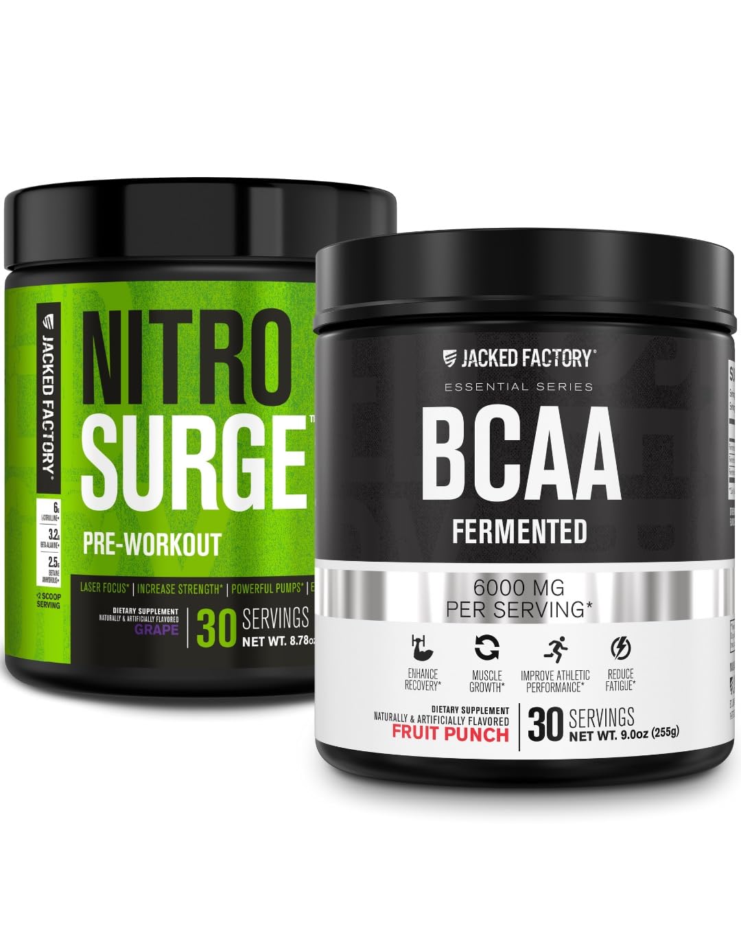 Ignite Muscle Protein Synthesis. BCAA powder works rapidly to ignite muscle protein synthesis, which creates and fuels muscle growth. Best of all, BCAAs are highly versatile. Try taking Jacked Factory BCAAs between meals, before bed, or during training for a surge of high-quality, muscle-building amino acids!. Nitric Oxide Boosting Pre Work Out Supplement: Nitrosurge elevates muscle pumps during training thanks to clinical doses of L-citrulline and betaine anhydrous — two proven nitric oxide boosters. Feel the satisfaction of skin-tearing pumps every time you hit the gym with this best-rated pre-workout supplement. Support Muscle Growth, Recovery, & Endurance. BCAAs serve as crucial essential amino acids that regulate muscle growth and repair. In contrast to protein powder and many BCAA powders, Jacked Factory BCAAs feature high-quality fermented BCAAs that are rapidly absorbed, gentle on the stomach, and refreshing to drink while training. Best Pre-Workout Supplement for Athletes & Gym-Goers: We went the extra mile to create a science-backed, pre workout powder that helps improve body composition and athletic performance without the side effects of harsh stimulants and banned ingredients. Nitrosurge contains clean, effective, and pure ingredients that athletes and gym-goers can count on, including L-Citrulline, Betaine Anhydrous, Beta-Alanine, Caffeine, L-Theanine, and more. Nitrosurge & BCAA Bundle - Unbeatable Value: the ultimate Pre & Post Workout bundle. Nitrosurge is a creatine-free pre-workout for men and women, formulated with evidence-based ingredients that boost nitric oxide (NO), energy, and strength for hours on end while Jacked Factory BCAA’s provides 6000mg of 2:1:1 branched-chain amino acids to help athletes, bodybuilders, gym-goers, and fitness enthusiasts support muscle recovery, reduce muscle tissue breakdown, and enhance performance.