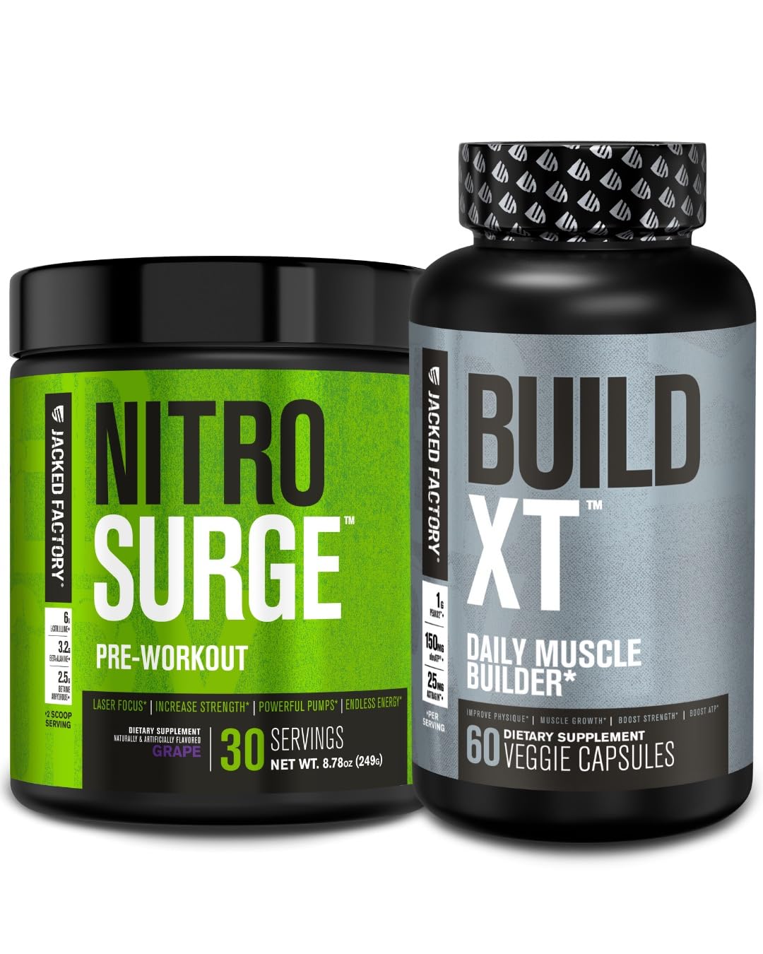 Jacked Factory Nitrosurge Pre-Workout in Grape & Build XT Muscle Building Bundle for Men & Women