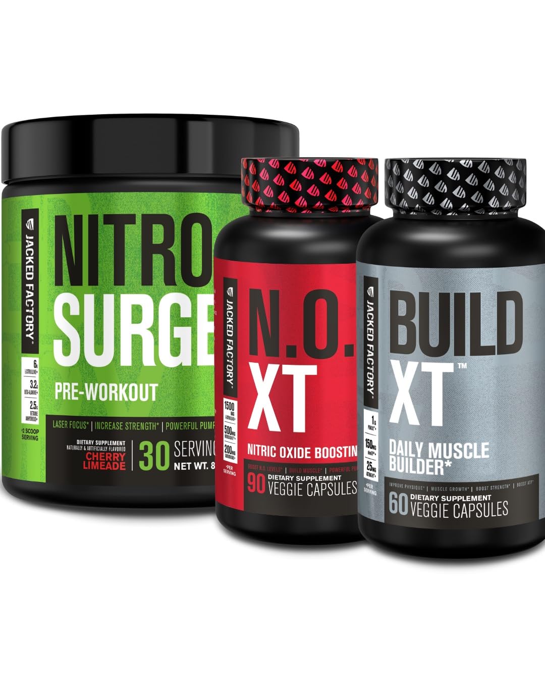 Jacked Factory Nitrosurge Pre Workout N.O. XT Nitric Oxide Supplement & Build-XT Daily Muscle Builder Bundle