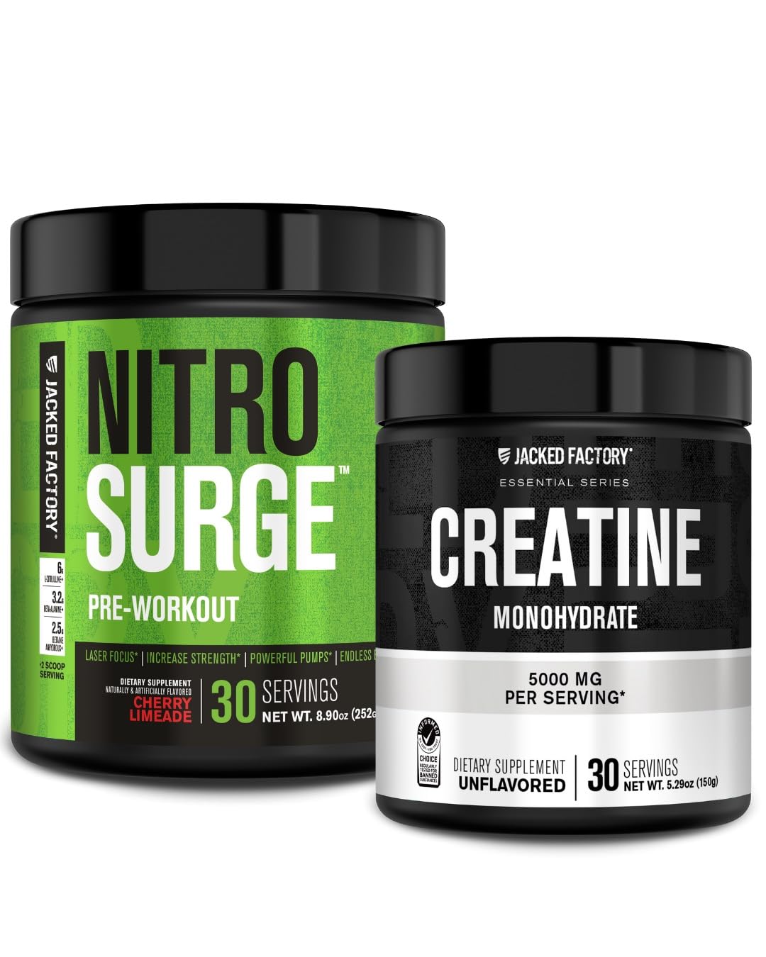 Manufactured in a cGMP-Certified Facility: Unlike many dietary supplements, all Jacked Factory products are manufactured under stringent quality control standards to ensure proper purity and potency. This formula is completely free of harsh chemicals, fillers, and artificial food dyes. Backed by Science: Creatine monohydrate remains the gold standard of creatine supplements, with hundreds of research studies proving its effectiveness in athletes, bodybuilders, and gym-goers alike. It's the most thoroughly studied form of creatine, and it’s the only form proven well beyond a reasonable doubt to be effective for enhancing athletic performance, muscle building, and recovery. Pure Creatine Monohydrate Powder for Pre or Post Workout: Jacked Factory Creatine Monohydrate powder features 5000mg of unflavored, pure creatine monohydrate in every scoop. Our creatine powder mixes easily in virtually any liquid and can be stacked with your favorite fitness supplements, such as pre-workout and BCAAs. Nitric Oxide Boosting Pre Work Out Supplement: Nitrosurge elevates muscle pumps during training thanks to clinical doses of L-Citrulline and Betaine Anhydrous — two proven nitric oxide boosters. Feel the satisfaction of skin-tearing pumps every time you hit the gym with this best-rated pre-workout supplement. Pre Workout Powder for Energy, Strength, & Blood Flow: Nitrosurge is a creatine-free pre-workout for men and women, formulated with evidence-based ingredients that boost nitric oxide (NO), energy, and strength for hours on end. As a best rated pre workout supplement , Nitrosurge delivers peak performance, laser focus, and intense pumps every single training session.