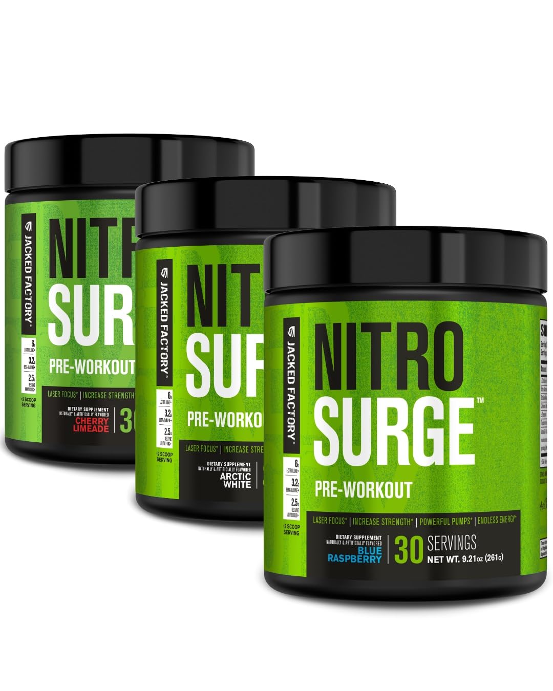 Manufactured in a cGMP-Certified Facility: All Jacked Factory products are manufactured under stringent quality control standards to ensure proper purity and potency. This formula is completely free of harsh chemicals, fillers, and artificial food dyes. Ingredients Backed by Science. Nitrosurge pre-workout powder optimizes the key components of athletic performance — energy, mental sharpness, focus, muscle pumps, strength, and stamina — with ingredients that are backed by science and clinical research. Nitric Oxide Boosting Pre Work Out Supplement: Nitrosurge elevates muscle pumps during training thanks to clinical doses of L-Citrulline and Betaine Anhydrous — two proven nitric oxide boosters. Feel the satisfaction of skin-tearing pumps every time you hit the gym with this best-rated pre-workout supplement. Best Pre-Workout Supplement for Athletes & Gym-Goers: We went the extra mile to create a science-backed, pre workout powder that helps improve body composition and athletic performance without the side effects of harsh stimulants and banned ingredients. Nitrosurge contains clean, effective, and pure ingredients that athletes and gym-goers can count on, including L-Citrulline, Betaine Anhydrous, Beta-Alanine, Caffeine, L-Theanine, and more. Pre Workout Powder for Energy, Strength, & Blood Flow: Nitrosurge is a creatine-free pre-workout for men and women, formulated with evidence-based ingredients that boost nitric oxide (NO), energy, and strength for hours on end. As a best rated pre workout supplement , Nitrosurge delivers peak performance, laser focus, and intense pumps every single training session.