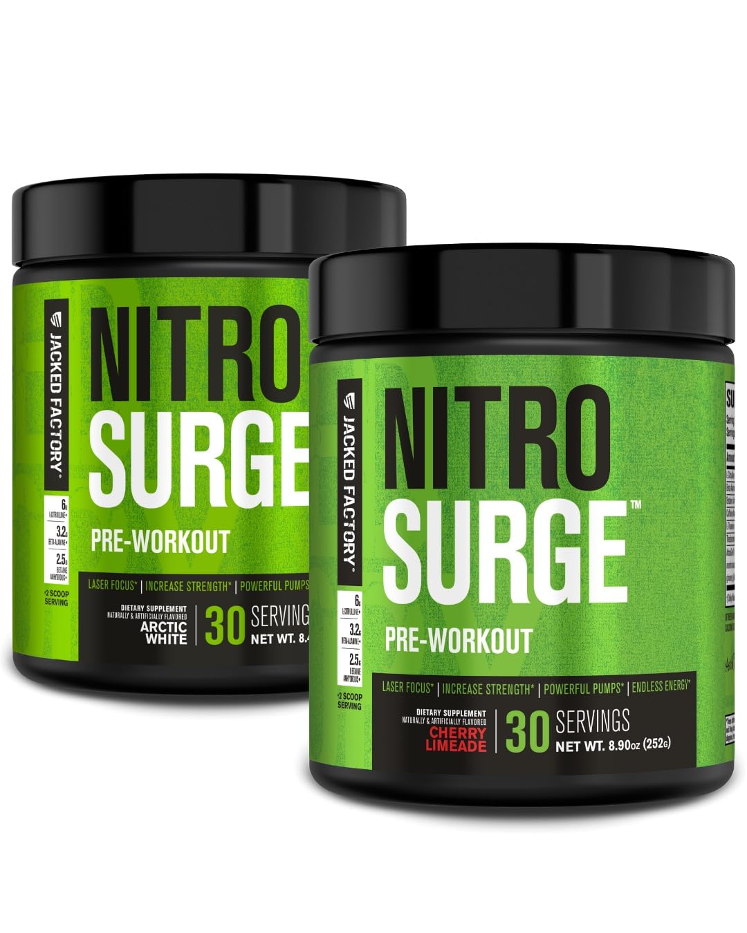 Manufactured in a cGMP-Certified Facility: All Jacked Factory products are manufactured under stringent quality control standards to ensure proper purity and potency. This formula is completely free of harsh chemicals, fillers, and artificial food dyes. Ingredients Backed by Science. Nitrosurge pre-workout powder optimizes the key components of athletic performance — energy, mental sharpness, focus, muscle pumps, strength, and stamina — with ingredients that are backed by science and clinical research. Nitric Oxide Boosting Pre Work Out Supplement: Nitrosurge elevates muscle pumps during training thanks to clinical doses of L-Citrulline and Betaine Anhydrous — two proven nitric oxide boosters. Feel the satisfaction of skin-tearing pumps every time you hit the gym with this best-rated pre-workout supplement. Best Pre-Workout Supplement for Athletes & Gym-Goers: We went the extra mile to create a science-backed, pre workout powder that helps improve body composition and athletic performance without the side effects of harsh stimulants and banned ingredients. Nitrosurge contains clean, effective, and pure ingredients that athletes and gym-goers can count on, including L-Citrulline, Betaine Anhydrous, Beta-Alanine, Caffeine, L-Theanine, and more. Pre Workout Powder for Energy, Strength, & Vascularity: Nitrosurge is a creatine-free pre-workout for men and women, formulated with evidence-based ingredients that boost nitric oxide (NO), energy, and strength for hours on end. As a best rated pre workout supplement , Nitrosurge delivers peak performance, laser focus, and intense pumps every single training session.