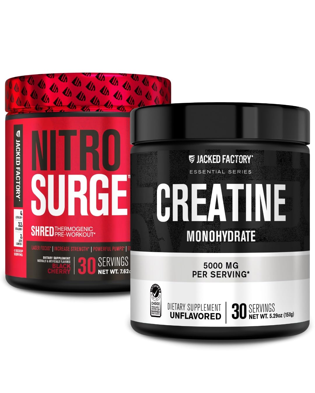 Jacked Factory NITROSURGE Shred Pre Workout Supplement (Black Cherry 30 Servings) & Creatine Monohydrate Powder (Unflavored 30 Servings)