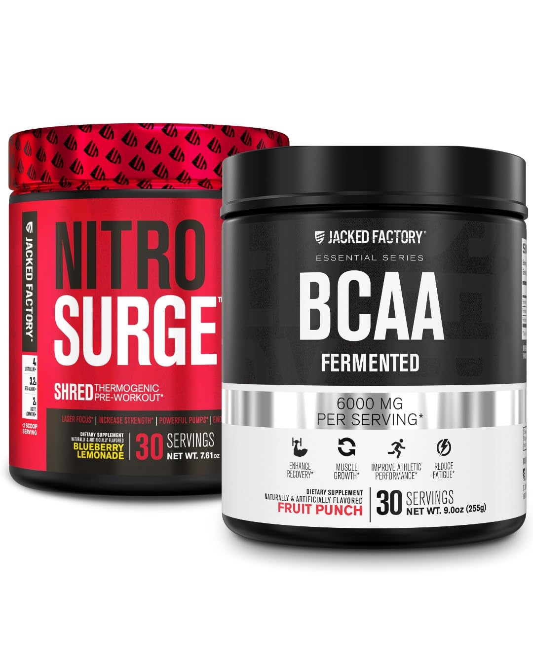 Ignite Muscle Protein Synthesis. BCAA powder works rapidly to ignite muscle protein synthesis, which creates and fuels muscle growth. Best of all, BCAAs are highly versatile. Try taking Jacked Factory BCAAs between meals, before bed, or during training for a surge of high-quality, muscle-building amino acids!. Pre Workout for Physique Improvements: Boost nitric oxide (NO) levels and blood-flow to the muscle to maximize pumps, endurance, strength, and fuel muscle growth. This potent pre workout powder contains no artificial fillers or food dyes and is like no other preworkout supplements on the market. Support Muscle Growth, Recovery, & Endurance. BCAAs serve as crucial essential amino acids that regulate muscle growth and repair. In contrast to protein powder and many BCAA powders, Jacked Factory BCAAs feature high-quality fermented BCAAs that are rapidly absorbed, gentle on the stomach, and refreshing to drink while training. Pre Workout for Physique Improvements: Improve your physique without sacrificing hard-earned muscle mass. Experience clean energy, enhanced nitric oxide (NO) & blood flow, increased stamina, and precision focus so you can dominate your training sessions. Nitrosurge Shred & BCAA Bundle - Unbeatable Value: the ultimate Pre & Post Workout bundle. Nitrosurge Shred is a creatine-free, fat burning pre-workout for men and women, formulated with evidence-based ingredients that boost nitric oxide (NO), energy, and help with body recomposition. Jacked Factory BCAA’s provides 6000mg of 2:1:1 branched-chain amino acids to help athletes, bodybuilders, gym-goers, and fitness enthusiasts support muscle recovery, reduce muscle tissue breakdown, and enhance perf.