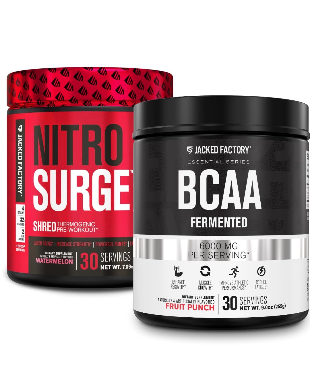 Ignite Muscle Protein Synthesis. BCAA powder works rapidly to ignite muscle protein synthesis, which creates and fuels muscle growth. Best of all, BCAAs are highly versatile. Try taking Jacked Factory BCAAs between meals, before bed, or during training for a surge of high-quality, muscle-building amino acids!. Pre Workout for Physique Improvements: Boost nitric oxide (NO) levels and blood-flow to the muscle to maximize pumps, endurance, strength, and fuel muscle growth. This potent pre workout powder contains no artificial fillers or food dyes and is like no other preworkout supplements on the market. Support Muscle Growth, Recovery, & Endurance. BCAAs serve as crucial essential amino acids that regulate muscle growth and repair. In contrast to protein powder and many BCAA powders, Jacked Factory BCAAs feature high-quality fermented BCAAs that are rapidly absorbed, gentle on the stomach, and refreshing to drink while training. Pre Workout for Physique Improvements: Improve your physique without sacrificing hard-earned muscle mass. Experience clean energy, enhanced nitric oxide (NO) & blood flow, increased stamina, and precision focus so you can dominate your training sessions. Nitrosurge Shred & BCAA Bundle - Unbeatable Value: the ultimate Pre & Post Workout bundle. Nitrosurge Shred is a creatine-free, fat burning pre-workout for men and women, formulated with evidence-based ingredients that boost nitric oxide (NO), energy, and help with body recomposition. Jacked Factory BCAA’s provides 6000mg of 2:1:1 branched-chain amino acids to help athletes, bodybuilders, gym-goers, and fitness enthusiasts support muscle recovery, reduce muscle tissue breakdown, and enhance perf.