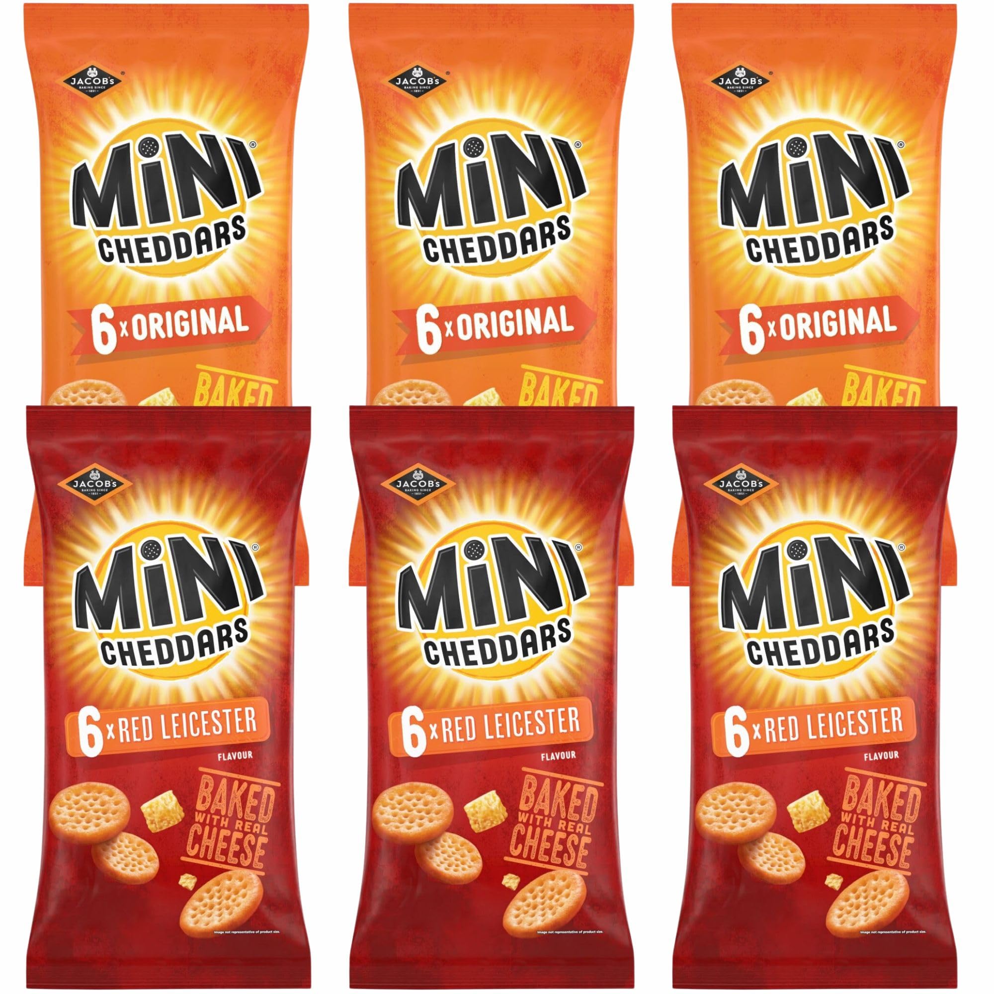 Step into the enchanting realm of Jacob's Mini Cheddars, where two iconic cheese flavors reign supreme. With this mixed bundle, savor the age-old love of Original cheddar and the distinct richness of Red Leicester, all wrapped in bite-sized crunchy delights. These aren't just snacks they are mini celebrations of flavor, tailor-made for the discerning cheese aficionado. Whether you're setting out on an adventure, prepping for a cozy movie night, or looking for that perfect midday snack, this 6 pack mixed bundle is your passport to a world where cheese takes center stage. Revel in Jacob's commitment to quality, taste, and tradition, one bite at a time. Ingredients: Flour (Wheat Flour, Calcium, Iron, Niacin, Thiamin), Vegetable Oils (Palm, Sunflower), Dried Powdered Cheese (6 ) (Milk), Barbecue Flavour [Wheat Flour, Dried Autolysed Yeast, Salt, Acidity Regulator (Sodium Diacetate), Onion Powder, Dried Yeast Extract, Sugar, Tomato Powder, Garlic Powder, Molasses, Flavourings, Acid (Citric Acid), Smoke Flavourings, Colour (Paprika Extract), Cayenne Extract], Glucose Syrup, Sugar, Dried Whey (Milk), Barley Malt Extract, Raising Agents (Ammonium Bicarbonate, Sodium Bicarbonate), Salt, Acid (Lactic Acid), FlavouringsQuality You Can Trust: Hailing from Jacob's legacy of snack perfection, these Mini Cheddars epitomize consistent quality, delivering impeccable flavor and texture with each munch. Flavorful Flexibility: Whether you're hankering after the traditional taste of Original cheddar or the distinctive allure of Red Leicester, this bundle offers a delectable dichotomy for your palate. Perfectly Packaged: With each flavor variety packed in 6 individual mini bags, they are primed for on-the-spot snacking, adding that special touch to lunch breaks, or for those spontaneous craving moments. Crunchy Satisfaction: Skillfully baked to achieve their distinct crisp texture, each Mini Cheddar promises a delightful crunch, complemented by the full-bodied flavors they carry. Cheesy Extravaganza: This bundle unites the classic cheddar essence of Jacob's Mini Cheddars Original with the rich and slightly nutty undertones of the Red Leicester variant, giving cheese lovers a dream combo.