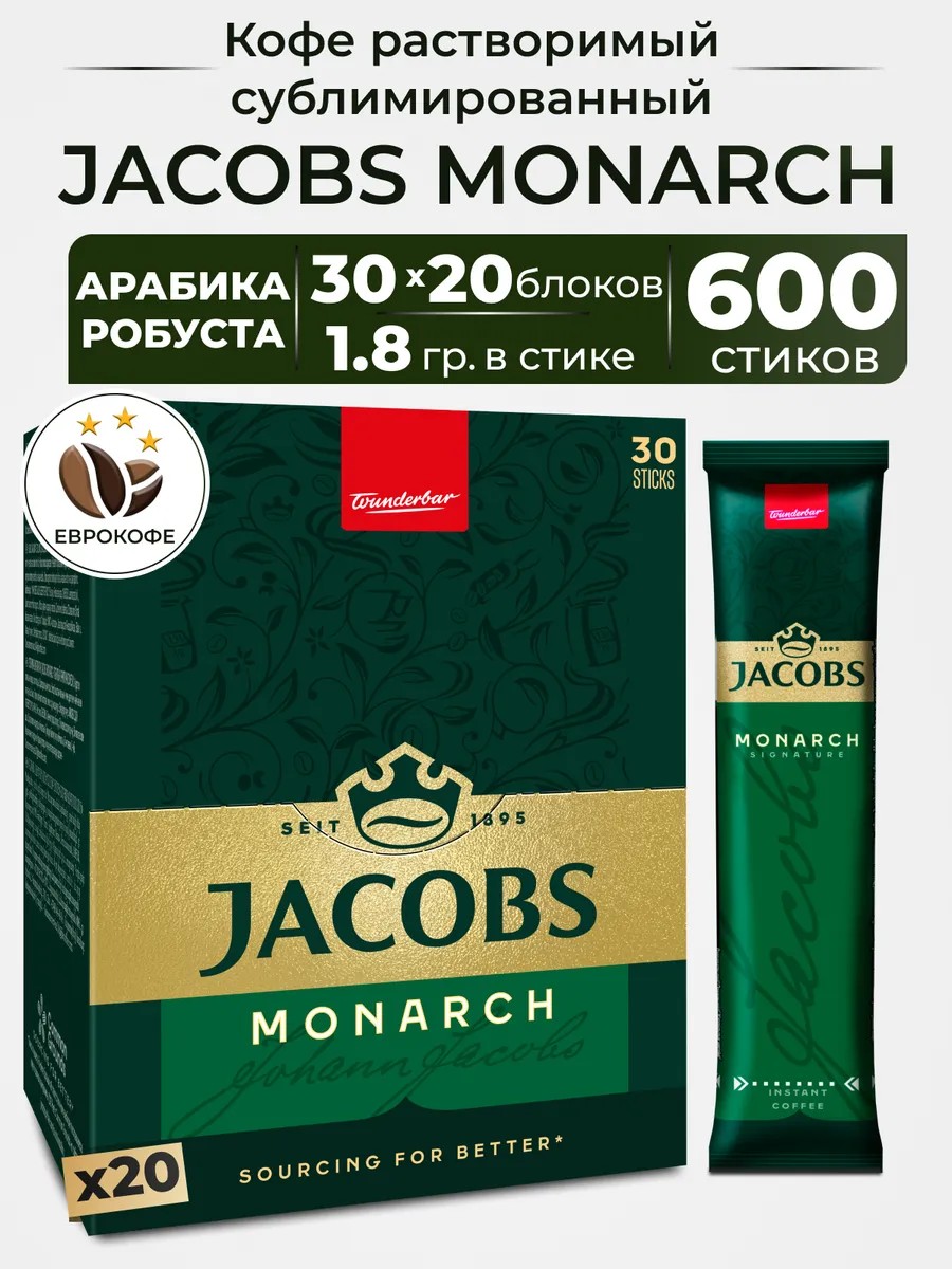 В наборе 20 пачек = 600 стиков растворимого кофе Якобс Монарх .