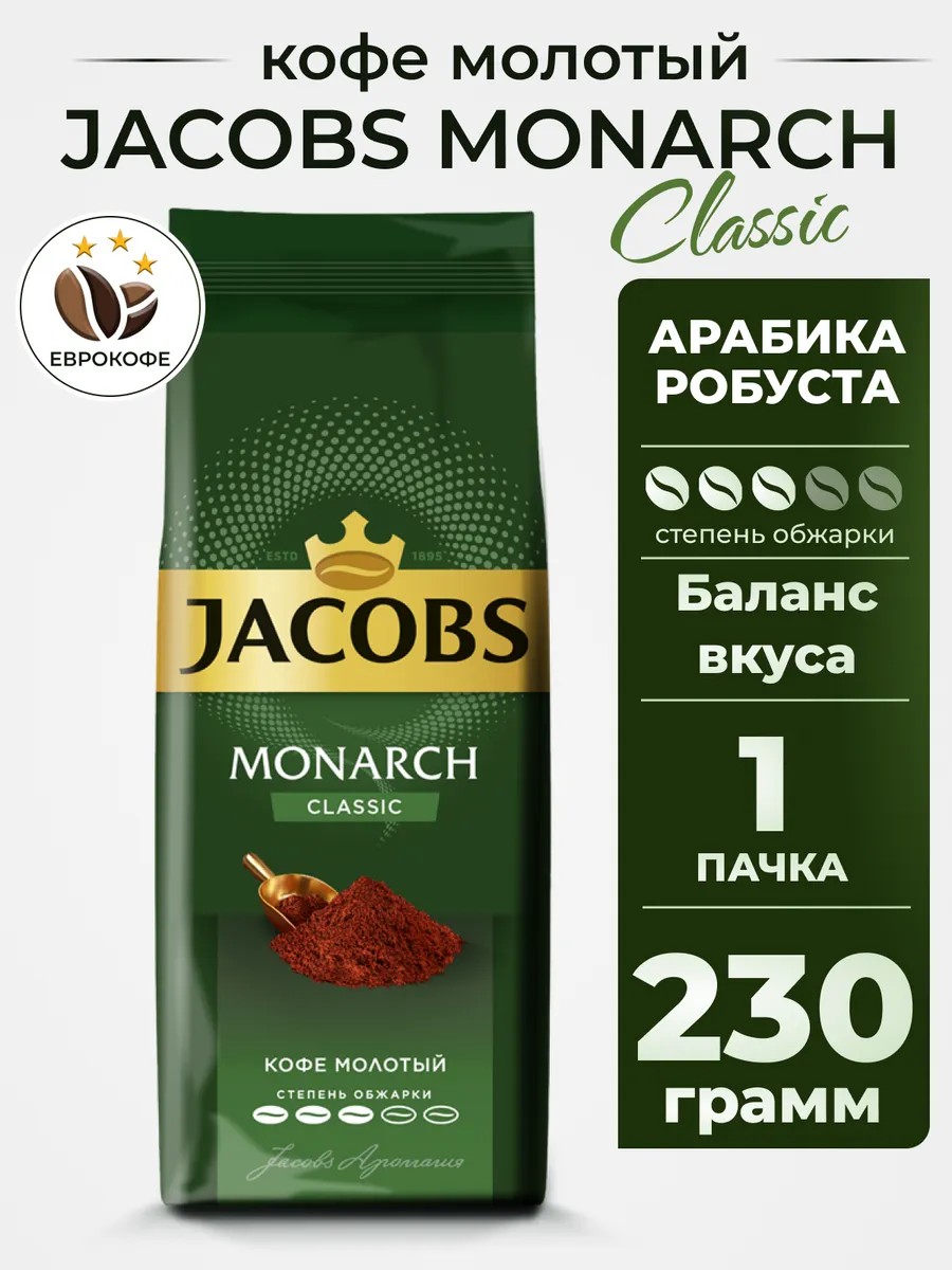 Молотый кофе Jacobs Monarch Classic в упаковке 230 грамм — это воплощение многолетних традиций и безупречного качества, которые уже более века ассоциируются с брендом Jacobs.