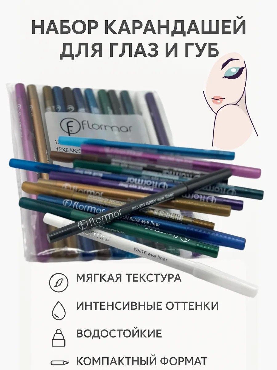 водостойкий карандаш для глаз, набор карандашей Flormar, eye & lip pencil, косметика для макияжа глаз, карандаш для губ, стойкий макияж, набор для визажиста, цветные карандаши, косметический карандаш, eyeliner, lip liner, водостойкий макияж, профессиональная косметика.