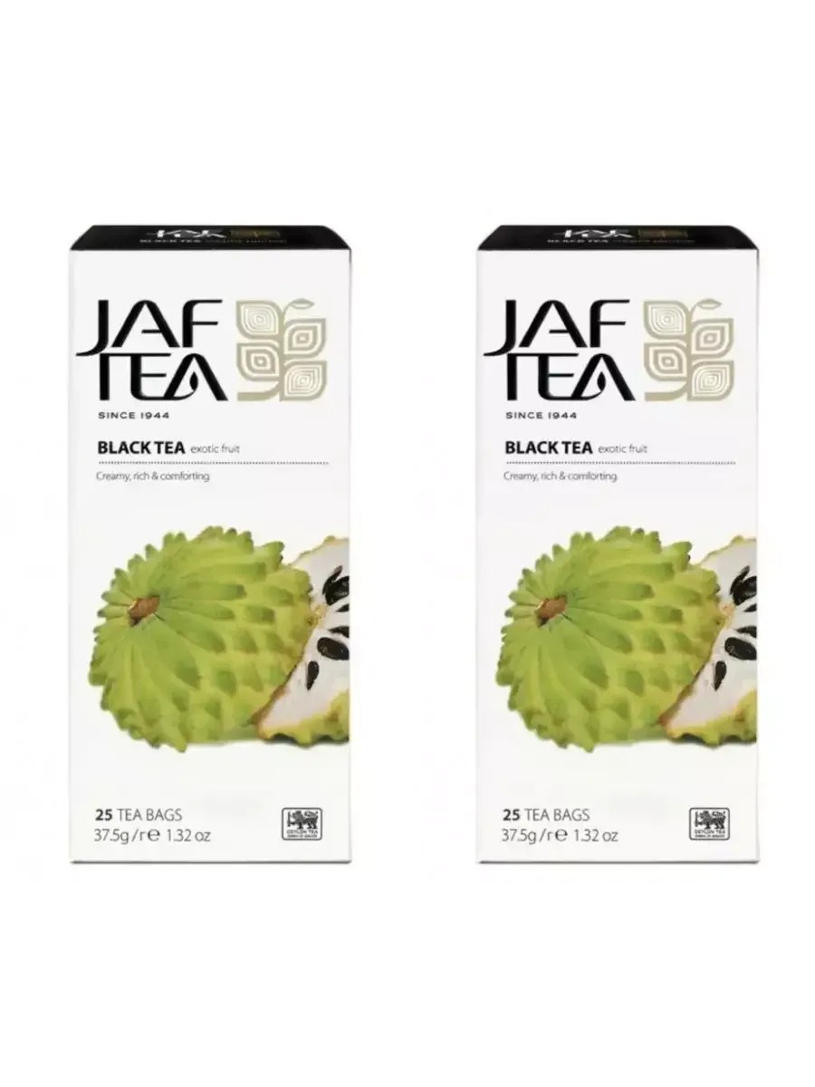 The set includes two packs of 25 tea bags. Jaf Tea PC Exotic Fruit black tea with soursop. The creamy, soft flavor of exotic soursop fruit combined with black Ceylon tea is a true masterpiece of blending. The exceptionally balanced aroma and flavor are enhanced by the addition of orange petals and marigold.