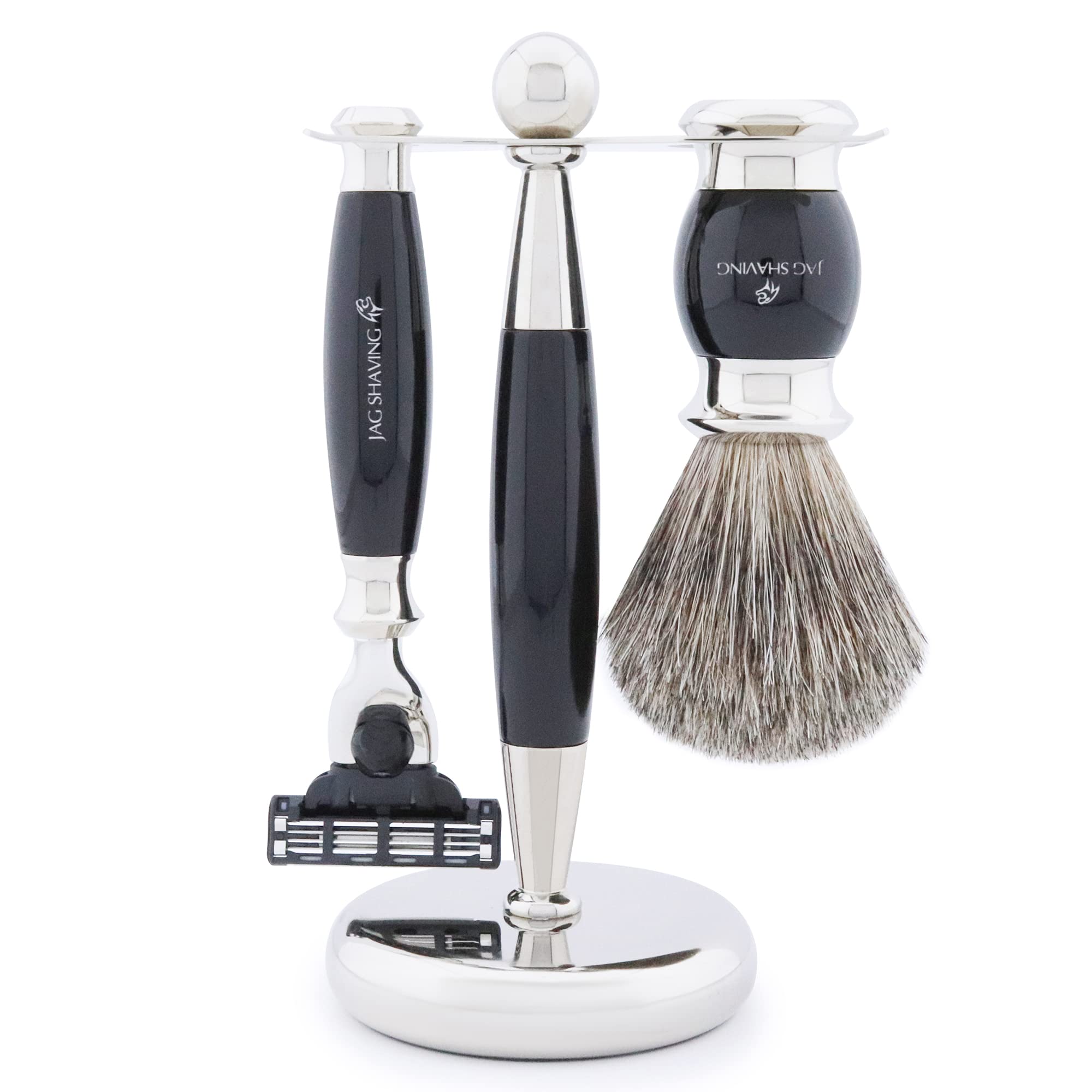 Jag Shaving Combines Quality, Aesthetics and Comfort in this Premium Shaving Set.Our High Quality Shaving Kit Contains Premium Shaving Tools That Provide An Effortless and Comfortable Shaving Experience While Supporting Moisturised and Fresh Skin.We offer a variety of shaving sets included vintage Wood Shaving sets, Modern Ivory or Black Collection Kits, Designer Shaving Sets Available in Gold, Maroon and Other Colors.We have different options for Shaving sets with different Shaving Products Search as Shaving Brush, Razor, Shaving bowl, Shaving Soap, Shaving stand, Shaving stand and aluminum pen.Please visit our store to find your desired combination of shaving products in one shaving set.JAG SHAVING IS A Premium Brand for Shaving Sets, Men's Shaving Brushes, Razors, Safety Razors and Various Personal Care and Care Products.We move the Approach of Sustainability and Inclusivity in our Products to Include Them Sustainably and for All Ages and Genders.We offer A 100 Money Back Guarantee If our Products do not like Customers.All of our Products are packaged aesthetically and safely to protect them from women in transit.They are a Perfect Gift for Any Occasion. Warnings For external use only.care: With correct application, care and standard washing practices, this shaving brush set can hold for years without losing a bristle and minimal damage to the natural hair bristles.Luxury shave wet razor men: This shaving set from the black collection is delivered in a designer box that exudes luxury and class.Ensures effortless beard.High quality shaving set for men gift set with an excellent finish offers perfect control.Also a perfect shaving set for teen gift set.Offers gentle wiping movements and thorough shaving.Hand-mounted shaving set shaving stand: The men's shaving brush set, which is produced in Great Britain, is made of metal.This stylish shaving set for men is suitable for face and body hair.Razor brush set, 3-part for the perfect shaving, contains: the black collection includes a high-quality super roof hair rasi brush, 3-cantile shaving plane, shaving stand.Jag Shaving combines quality, aesthetics and comfort in this premium shaving set. Our high quality shaving kit contains premium shaving tools that provide an effortless and comfortable shaving experience while supporting moisturised and fresh skin. We offer a variety of shaving sets including vintage wood shaving sets, modern ivory or black collection kits, designer shaving sets available in gold, maroon and other colours. We have different options for shaving sets with different shaving products such as shaving brush, razor, shaving bowl, shaving soap, shaving stand, shaving stand and alum pen. Please visit our store to find your desired combination of shaving products in one shaving set. Jag Shaving is a premium brand for shaving sets, men's shaving brushes, razors, safety razors and various personal care and care products. We move the approach of sustainability and inclusivity in our products to include them sustainably and for all ages and genders. We offer a 100 money back guarantee if our products do not like customers. All of our products are packaged aesthetically and safely to protect them from damage in transit. They are a perfect gift for any occasion. WARNHINWEISE For external use only.Pflege: Bei richtiger Anwendung, Pflege und Standardwaschpraktiken kann dieses Rasierpinselset jahrelang ohne Borstenverlust und minimale Beschädigung der natürlichen Haarborsten halten. Luxusrasur nassrasierer herren: Dieses Rasierset aus der schwarzen Kollektion wird in einer Designerbox geliefert, die Luxus und Klasse ausstrahlt. Sorgt für müheloses Bart. Hochwertiges Rasierset für Männer Geschenkset mit hervorragendem Finish bietet perfekte Kontrolle. Auch ein perfektes Rasierset für Teenager Geschenkset. Bietet sanfte Wischbewegungen und gründliche Rasur. Handmontiertes Rasierset Rasierständer: Das in Großbritannien hergestellte Herren-Rasierpinsel-Set besteht aus Metall. Dieses stylische Rasierset für Herren ist für Gesichts- und Körperbehaarung geeignet. Rasierpinsel Set, 3-teilig für die perfekte rasier enthält: Die schwarze Kollektion umfasst einen hochwertigen Super Dachshaar-Rasierpinsel, 3-kantiger Rasierhobel, Rasierständer.Jag Shaving Rasierset - 3-teiliges Rasierset mit Rasierpinsel - 3 Rasierklingen Rasierhobel - Super Dachshaar Rasierpinsel - Rasierständer - Schwarz Rasierset als Geschenkset