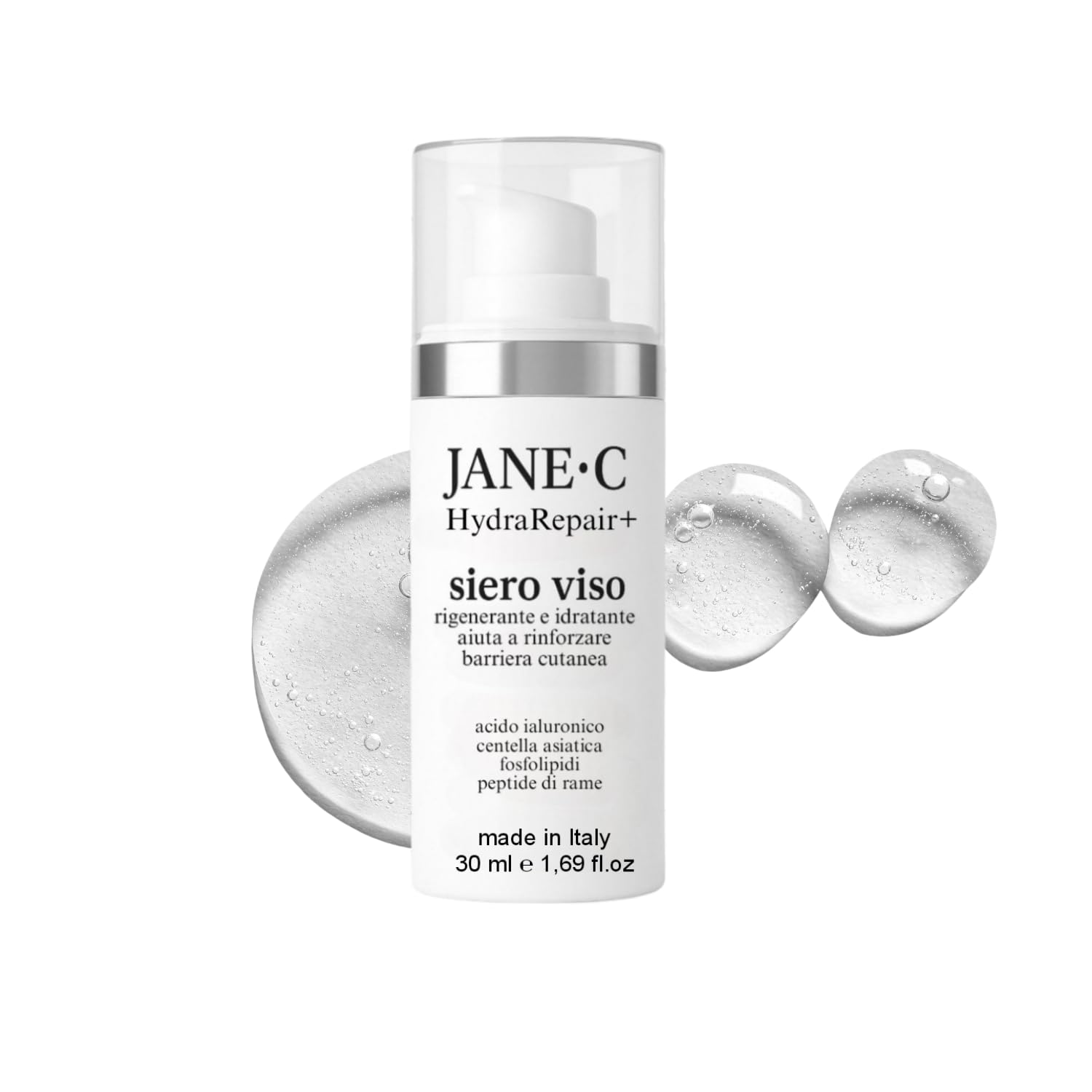 Discover the perfect blend of Italian expertise and K-Beauty innovation. The HydraRepair face serum combines 11 high-quality active ingredients to deeply hydrate, regenerate, and revitalize the skin. Enriched with regenerating snail mucin, soothing Centella asiatica, and repairing copper peptides, it promotes cell repair and strengthens the skin barrier. Its multi-layered formula, enriched with phospholipids, allows for effective penetration of the active ingredients into the different layers of the skin for long-lasting hydration and a supple, luminous texture. Free of silicones and sulfates, this 30ml serum is ideal for dehydrated, sensitive, or mature skin, leaving the complexion visibly smoother, more even, and radiant. Made in Italy, it combines premium quality and K-Beauty inspiration for an exceptional skincare ritual. INDICATIONS Dry Skin SAFETY WARNING For external use only. Avoid contact with eyes. Keep out of reach of children. Store at room temperature, away from heat and direct sunlight. Do not swallow. See moreFEATURES: 30ml bottle, silicone- and sulfate-free, suitable for dehydrated and sensitive skin. MULTI-LEVEL HYDRATION: Formula enriched with phospholipids for effective penetration into the different layers of the skin. ACTIVE COMPLEX: Unique combination of Centella asiatica and copper peptides for a repairing and soothing action. CELLULAR REGENERATION: Concentrated snail mucin for optimal regeneration and deep hydration of the epidermis. PREMIUM FORMULA: Facial serum with 11 high-quality active ingredients, inspired by Korean cosmetics and made in Italy.JANE•C Sérum Visage HydraRepair – Bave d'Escargot, Centella Asiatica, Peptides de Cuivre, Acide Hyaluronique, Style K-Beauty, Hydratation Intense et Régénération Multiniveau, Made in Italy, 30mlDESCRIPTION DU PRODUIT DESCRIPTION DU PRODUIT Découvrez l'alliance parfaite entre l'expertise italienne et l'innovation K-Beauty. Le sérum visage HydraRepair associe 11 ingrédients actifs de haute qualité pour hydrater, régénérer et revitaliser la peau en profondeur. Enrichi en bave d'escargot régénérante, Centella asiatica apaisante et peptides de cuivre réparateurs, il favorise la réparation cellulaire et renforce la barrière cutanée. Sa formule multistrate, enrichie en phospholipides, permet une pénétration efficace des actifs dans les différentes couches de la peau pour une hydratation durable et une texture souple et lumineuse. Sans silicones ni sulfates, ce soin de 30 ml est idéal pour les peaux déshydratées, sensibles ou matures, laissant le teint visiblement plus lisse, uniforme et éclatant. Fabriqué en Italie, il allie qualité premium et inspiration K-Beauty pour un rituel de soin d'exception. INDICATIONS Peau Sèche AVERTISSEMENT DE SÉCURITÉ Usage externe uniquement. Éviter tout contact avec les yeux. Tenir hors de portée des enfants. Conserver à température ambiante, à l'abri de la chaleur et de la lumière directe. Ne pas avaler. Voir plusCARACTÉRISTIQUES: Flacon de 30ml, sans silicones ni sulfates, adapté aux peaux déshydratées et sensibles. HYDRATATION MULTINIVEAU: Formule enrichie en phospholipides pour une pénétration efficace dans les différentes couches cutanées. COMPLEXE ACTIF: Association unique de Centella asiatica et peptides de cuivre pour une action réparatrice et apaisante. RÉGÉNÉRATION CELLULAIRE: Bave d'escargot concentrée pour une régénération optimale et une hydratation profonde de l'épiderme. FORMULE PREMIUM: Sérum visage avec 11 ingrédients actifs de haute qualité, inspiré de la cosmétique coréenne et fabriqué en Italie.