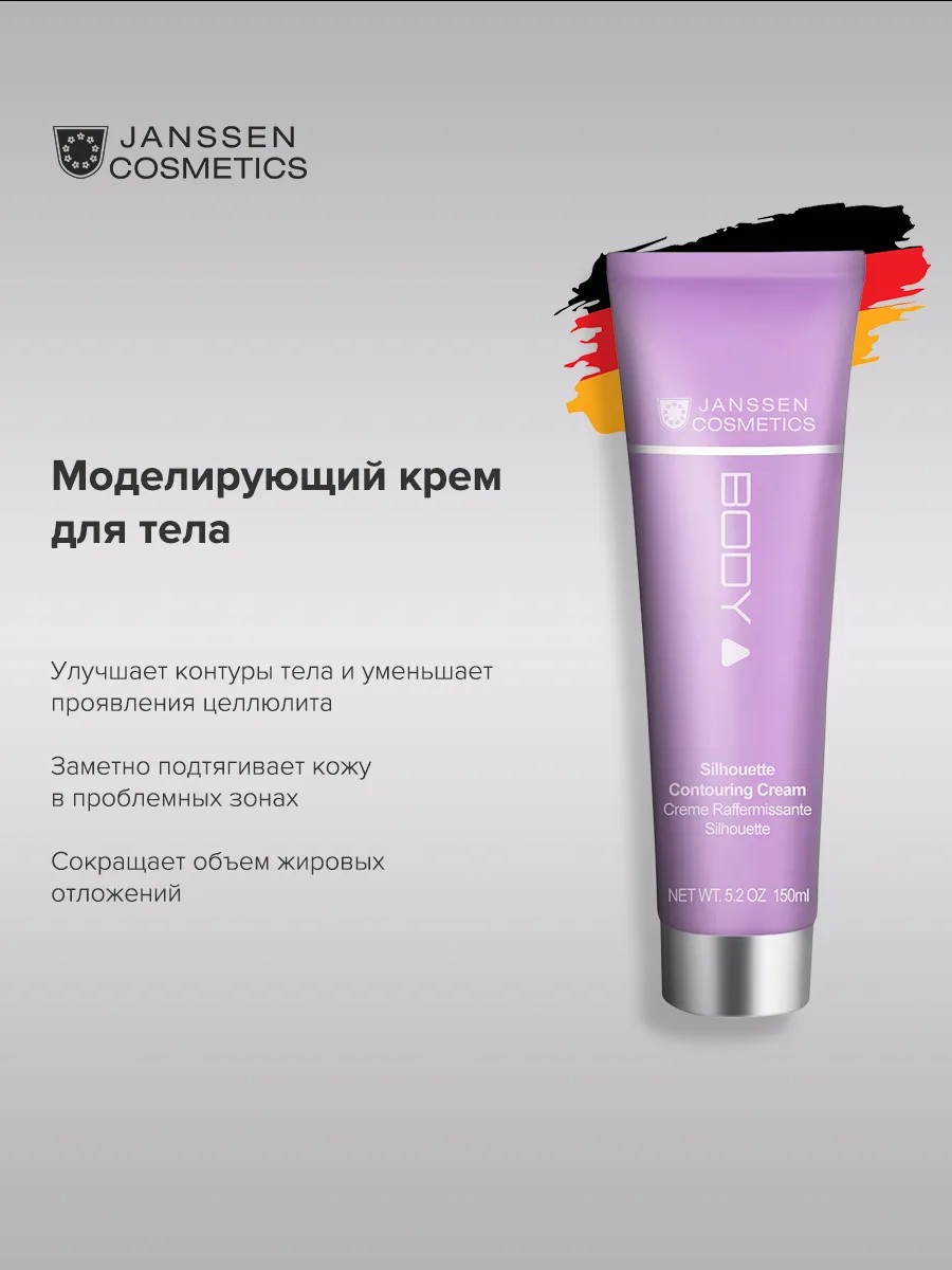 Silhouette Contouring Cream - A firming cream with a sculpting effect that improves body contours, reduces the appearance of cellulite, and helps prevent it. It smoothes the "orange peel" effect and visibly tightens the skin in problem areas. A highly active complex of plant ingredients—caffeine, guarana extract, kelp, ivy, and horsetail—helps accelerate lipolysis (fat breakdown) and achieve a noticeable lifting effect. The cream has a rich texture, spreads and absorbs easily, moisturizes, and softens the skin. Immediately after use, the skin becomes smoother, more elastic, and firm. With regular use, its quality and structure are significantly improved, fat deposits are reduced, and the silhouette appears toned and slender. Since Silhouette Contouring Cream does not have a pronounced warming effect, it can be used throughout the year. Benefits: Corrects body contours. Accelerates metabolism, reduces fat deposits in problem areas. Stimulates detoxification, reduces swelling. Smoothes the "orange peel" appearance and prevents cellulite. Improves microcirculation and strengthens blood vessels. Moisturizes, nourishes, and tightens the skin. Provides an anti-aging effect. Comfortable texture, neutral pleasant scent. Can be used year-round. Directions: Morning and evening after a shower or bath, apply Silhouette Contouring Cream to problem areas with vigorous massaging movements. It does not have a pronounced warming effect, so it can be used year-round to combat cellulite, including after a course of Body Contour Booster. Directions: Morning and evening after a shower or bath, apply the cream to problem areas with vigorous massaging movements. It does not have a pronounced warming effect, so it can be used to combat cellulite year-round, including after a course of Body Contour Booster.
