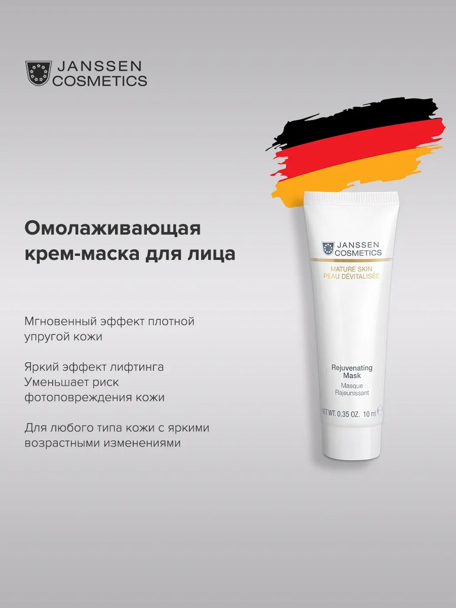 Rejuvenating Mask - Enriched with anti-aging ingredients, this mask energizes dull and tired skin in just minutes. Highly effective components of the Cellular Regeneration complex regenerate mature skin and strengthen its structure: red clover extract reduces wrinkles, tightens and hydrates the skin, kombucha fills wrinkles as a lipofiller, smoothes the skin, and improves its tone. The soothing Sensitive plant complex and bisabolol provide an immediate calming effect. Two types of hyaluronic acid intensively moisturize the skin, while valuable biomimetic oils saturate it with lipids and restore its protective barrier. After just one use, skin looks radiant, rested, and filled with vitality. Benefits: Multifunctional anti-aging mask: lifting, regeneration, improving complexion, smoothing wrinkles. Instant effect of dense, elastic skin and a luminous lifting effect. An innovative complex based on phytoestrogens and biomimetic active ingredients with an intense rejuvenating effect. Cumulative effect: reduces the appearance of wrinkles, improves microcirculation, reduces puffiness, and restores clarity of facial contours. Reduces the risk of photodamage to the skin and increases its resistance to external influences. Has a calming effect, relieves redness and irritation. SOS mask for the effect of perfect skin; a mask "for going out". All-season use. Economical consumption. For any skin type with visible age-related changes. How to use: Apply a thick layer to clean skin, leave for 10-15 minutes, and then remove the residue with a warm, damp compress. For very dry skin, you can apply the mask in the evening, let it absorb and blot the excess with a napkin. Janssen Cosmetics is a German brand of world-class professional cosmetics. We are the official exclusive representatives of the brand in Russia. Deliveries are direct from Germany, all products are original.
