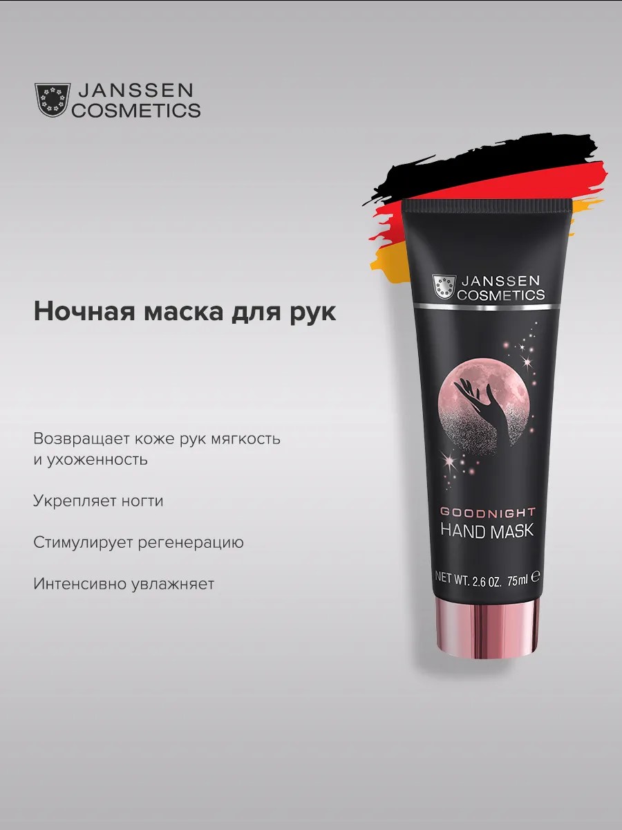 Goodnight Hand Mask is an enriched overnight mask with biotin, glycerin, bisabolol, and urea for intensive, comprehensive hand care. Its balanced formula moisturizes and soothes dry, stressed skin, nourishes cuticles, and strengthens nails. Directions: Apply to clean hands in the evening. Put on cotton gloves and leave on overnight. Recommended use: twice a week. Janssen Cosmetics is a world-class German brand of professional cosmetics. We are the official, exclusive representative of the brand in Russia. We source directly from Germany, and all products are genuine.